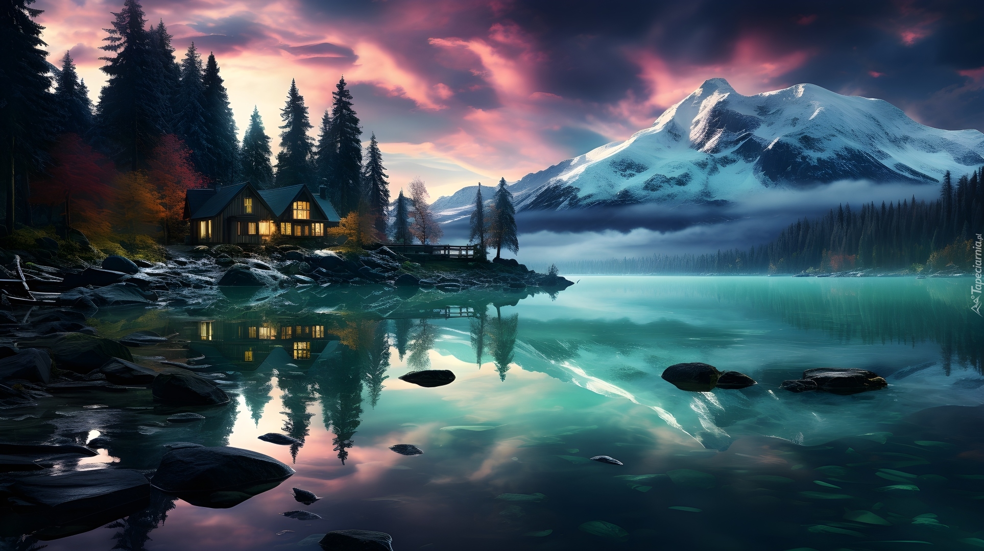 Edytor tapety: Oświetlony domek na brzegu jeziora