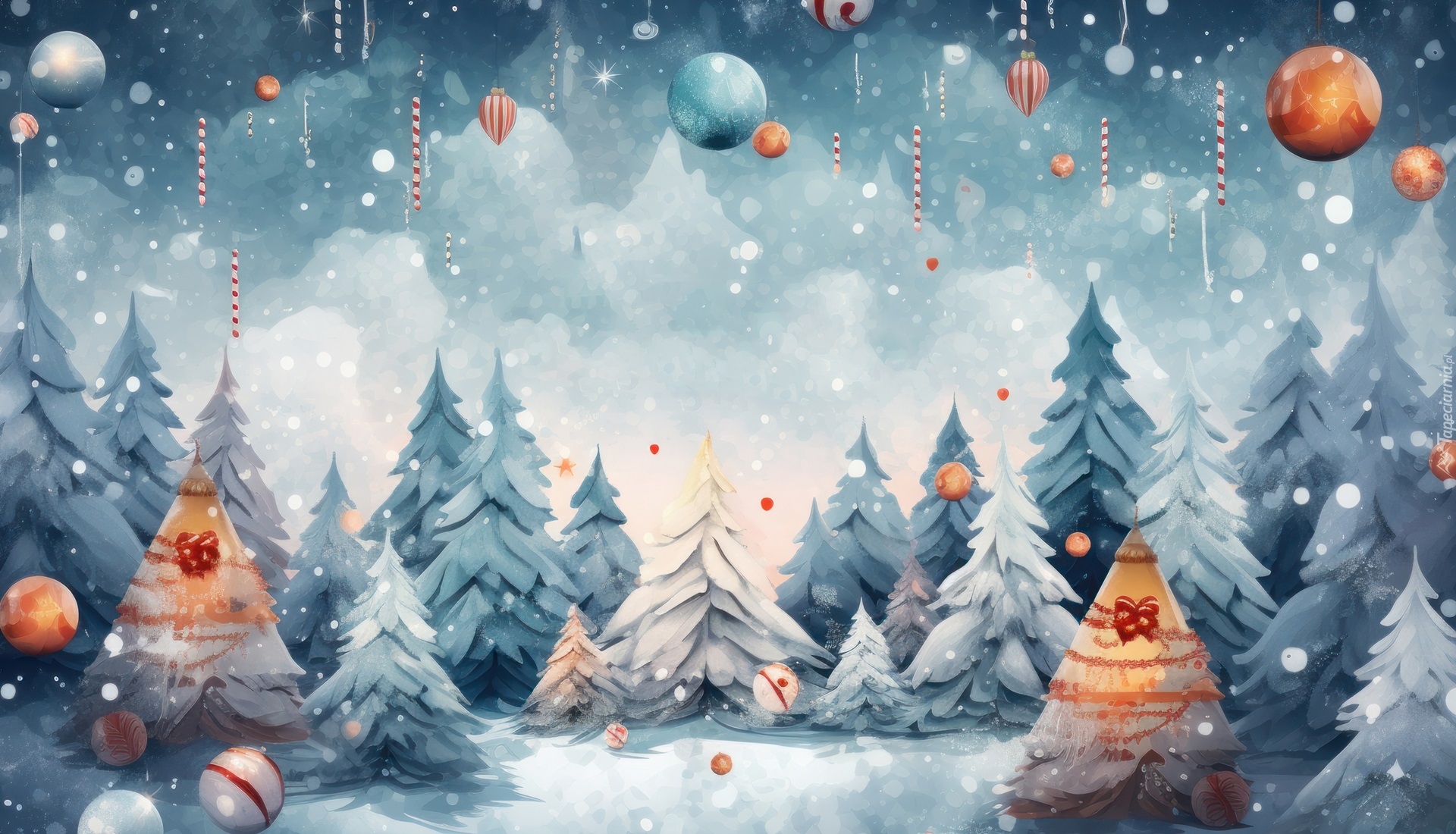 Edytor tapety: Bombki nad ośnieżonym lasem w grafice