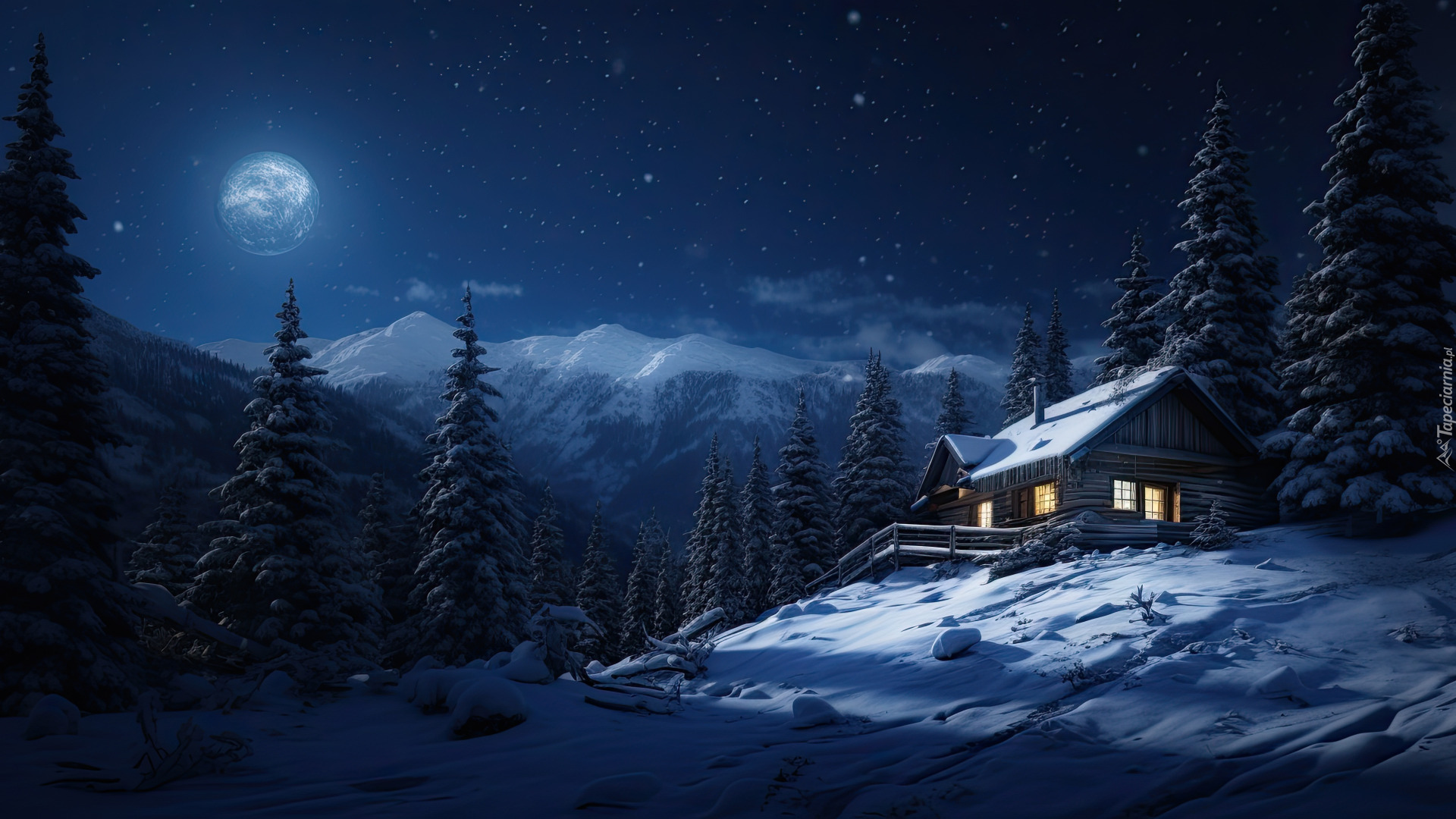 Edytor tapety: Ośnieżony dom obok drzew w świetle księżyca