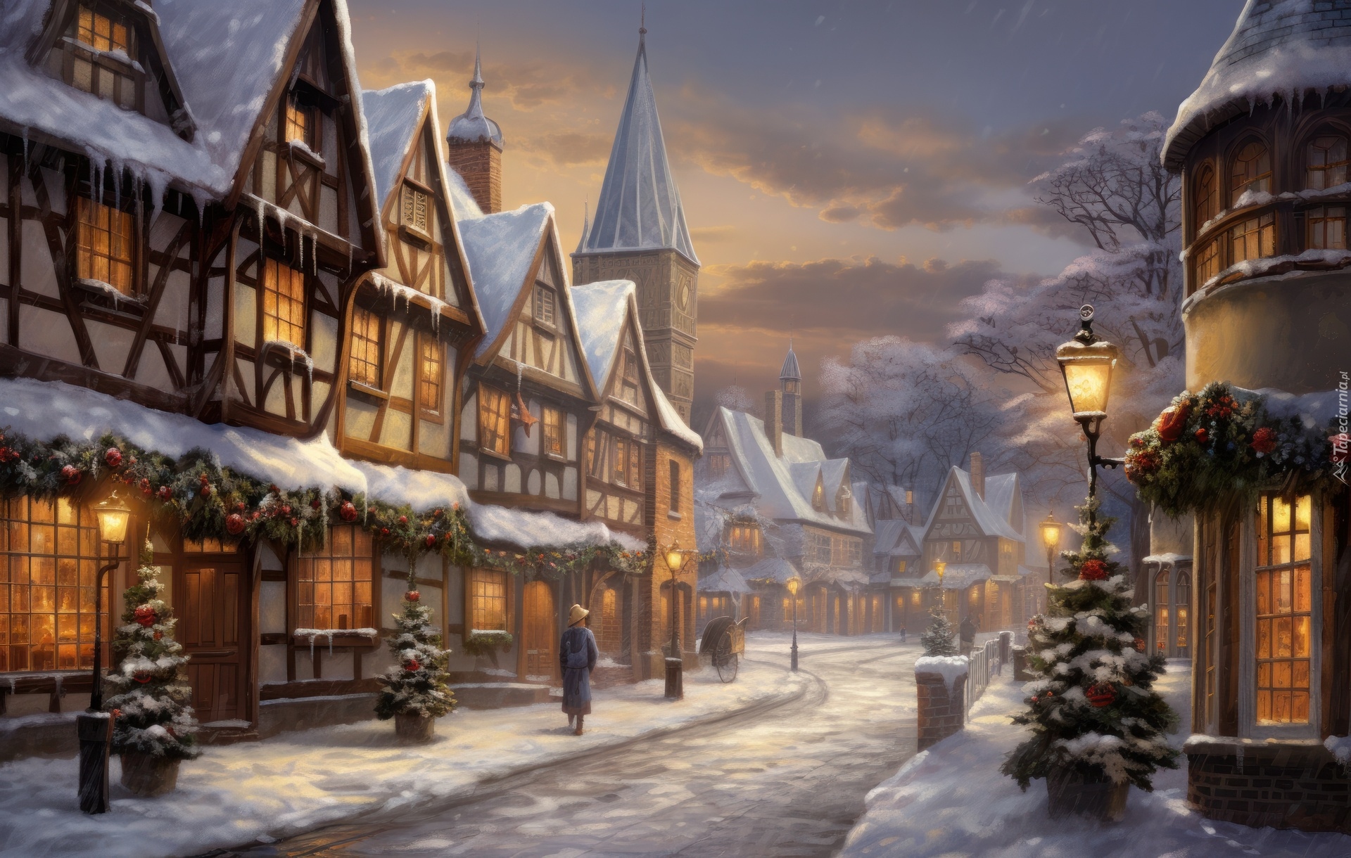 Edytor tapety: Zaśnieżona ulica i oświetlone domy
