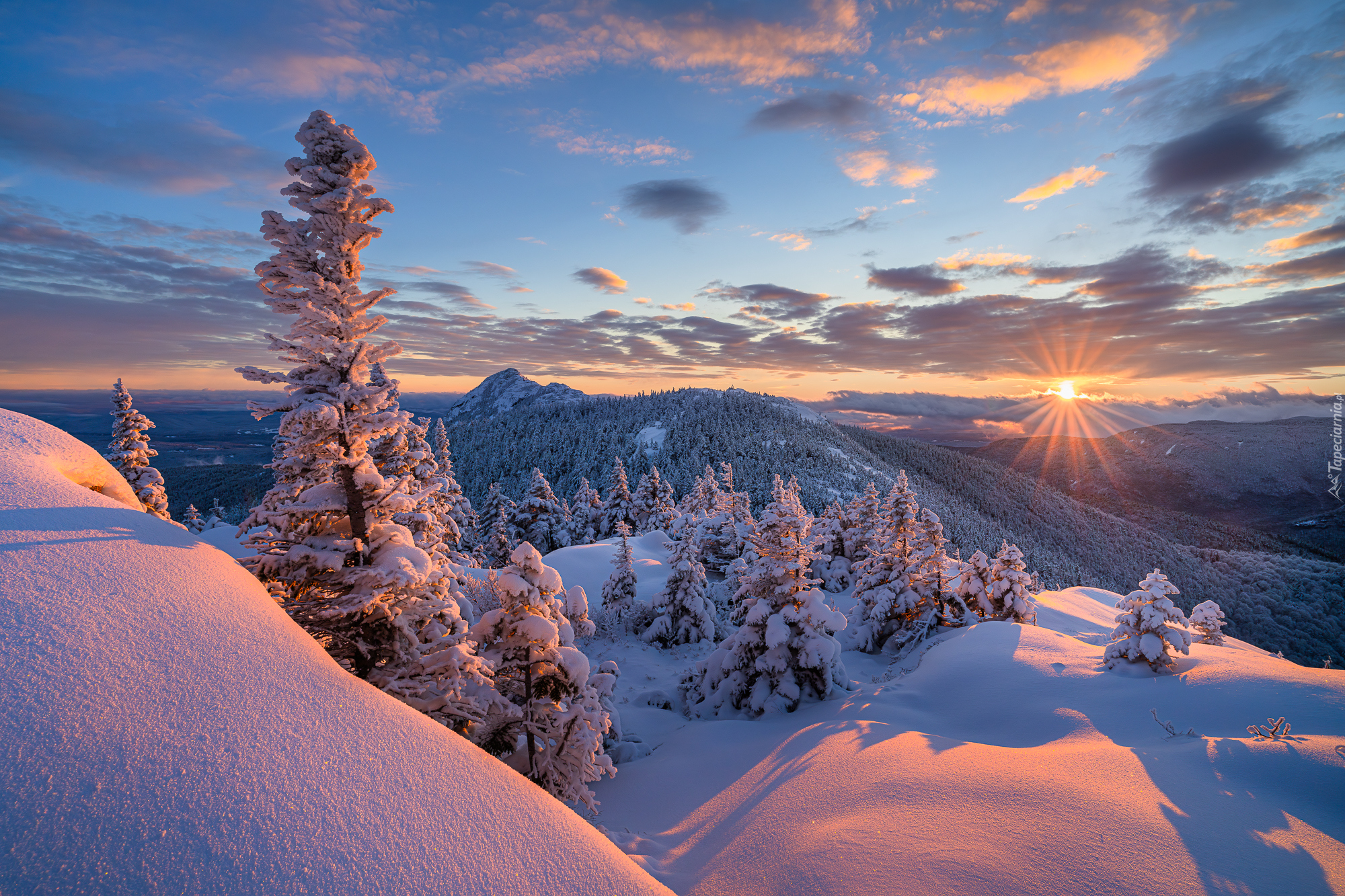 Edytor tapety: Ośnieżone drzewa w górach o wschodzie słońca