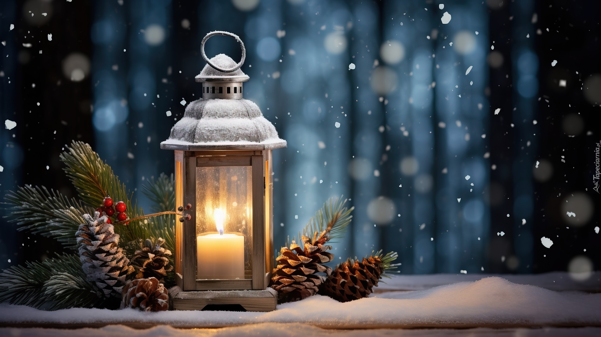 Edytor tapety: Zapalony lampion i szyszki na gałązkach na śniegu