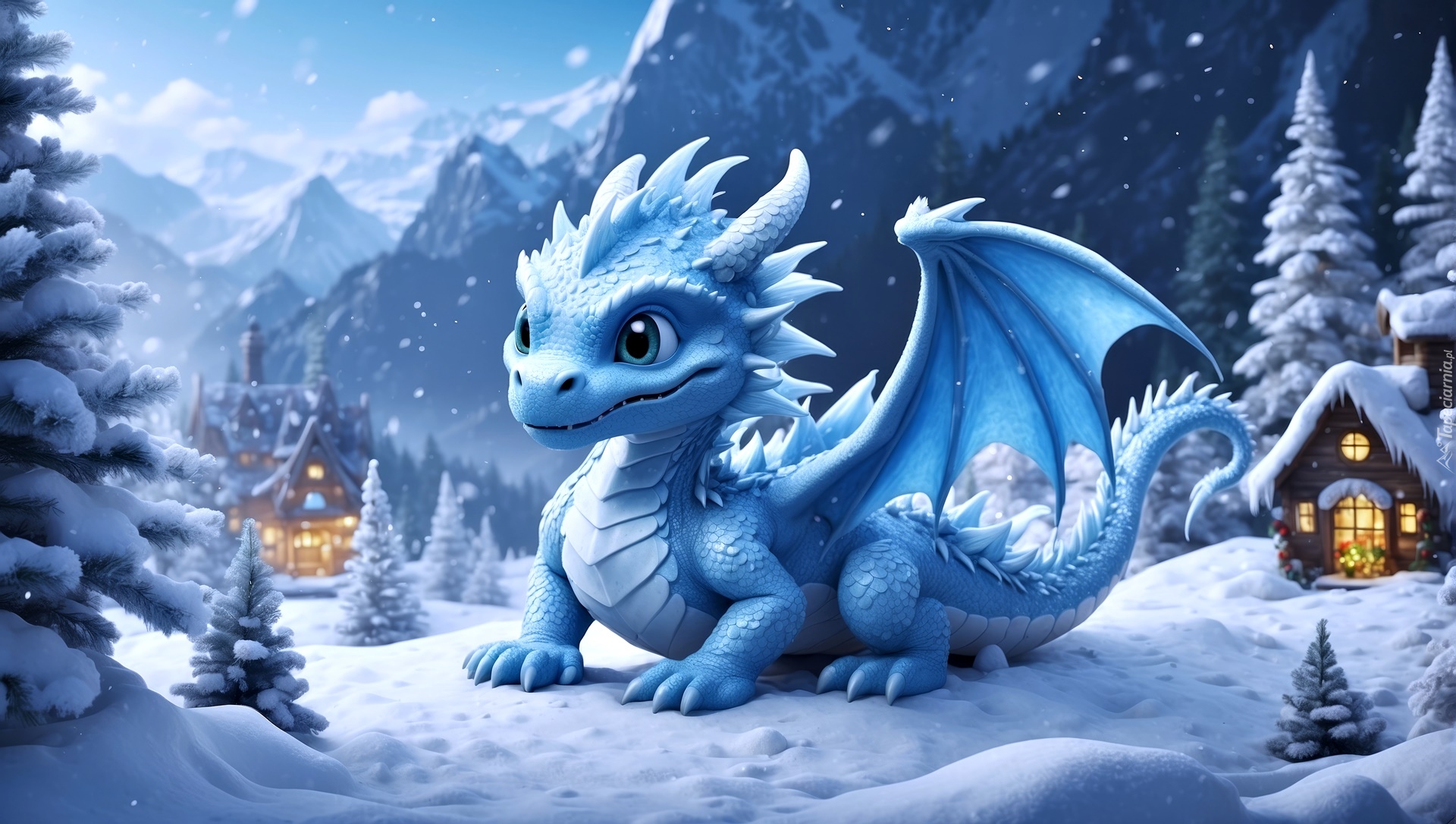 Edytor tapety: Niebieski smok i oświetlone domki