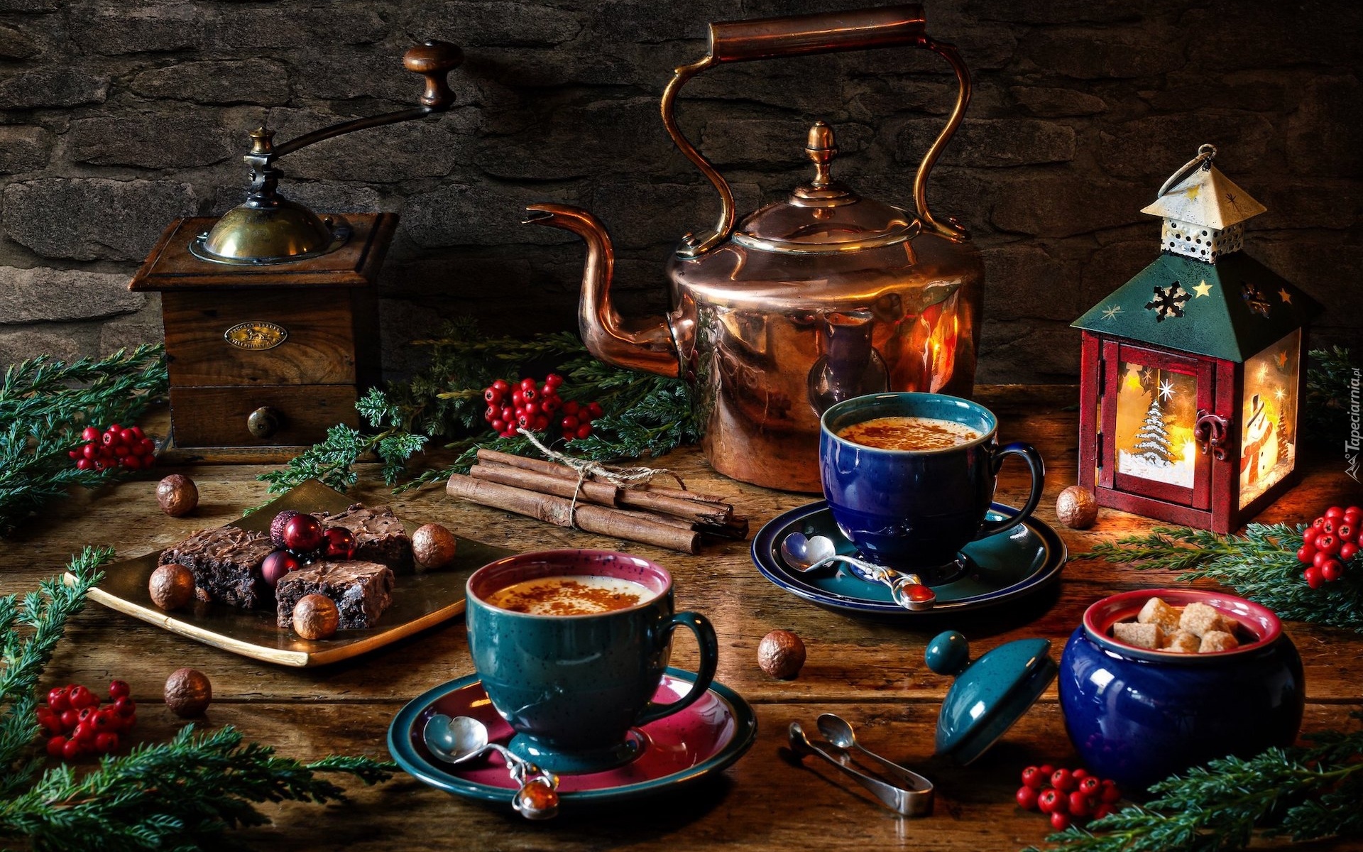 Edytor tapety: Filiżanki obok lampionu i czajnika na stole