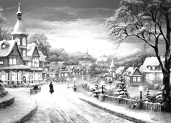 Edytor tapety: Kobieta na ośnieżonej drodze i oświetlone domy w miasteczku