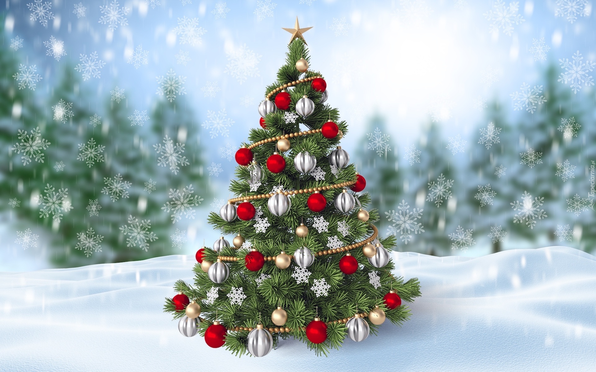 Edytor tapety: Czerwone i srebrne bombki na choince w grafice