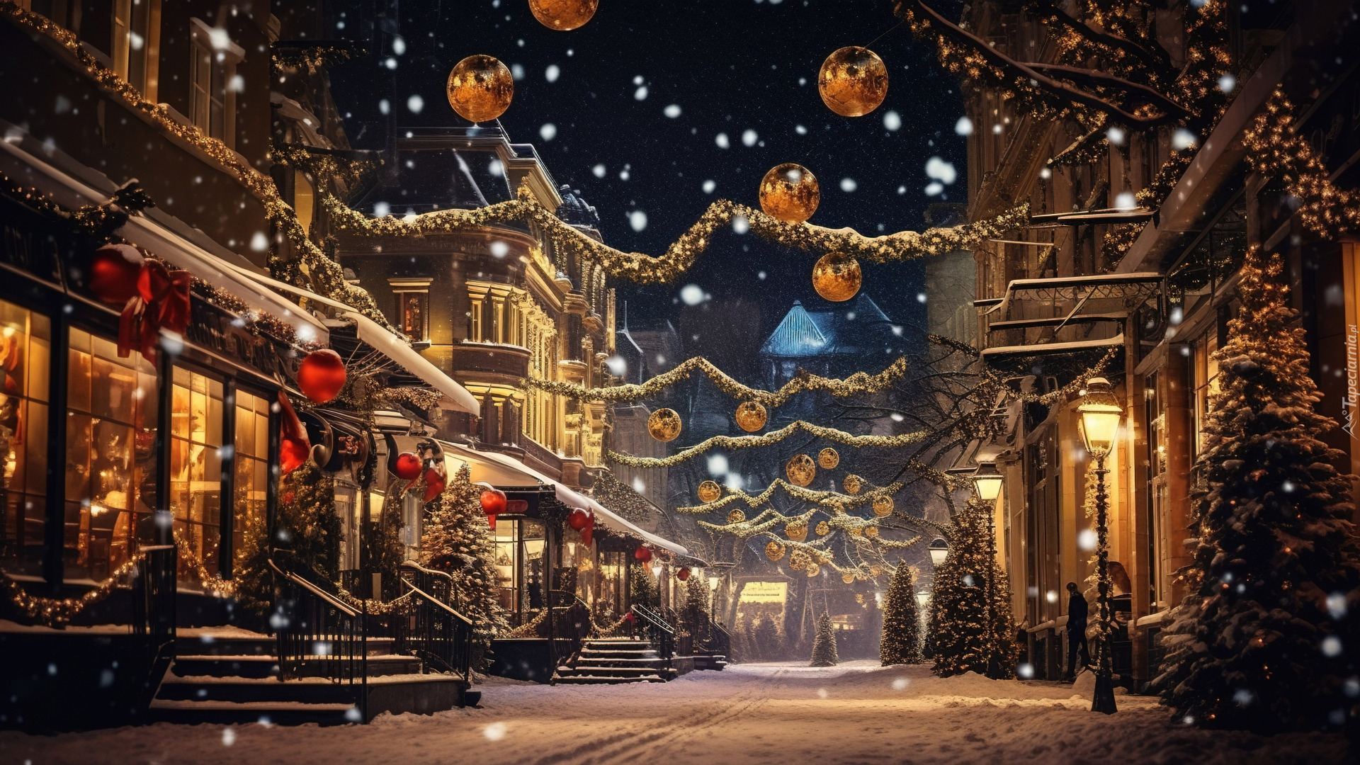Edytor tapety: Wiszące ozdoby świąteczne między domami nad ulicą