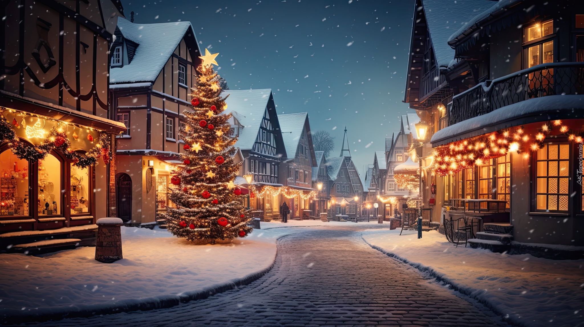 Edytor tapety: Choinka na chodniku i świątecznie udekorowane domy