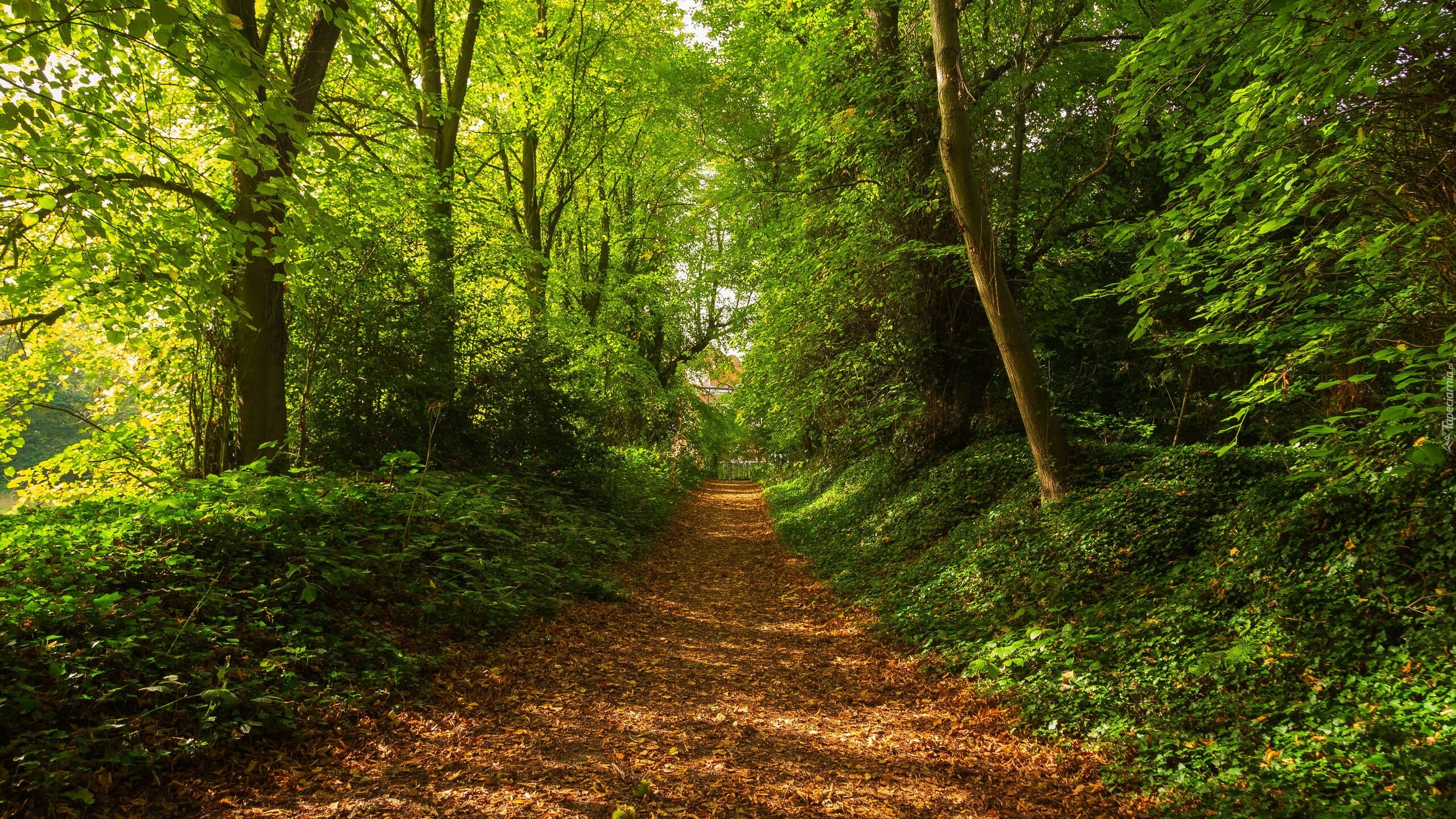 Edytor tapety: Szeroka ścieżka wśród zielonych drzew
