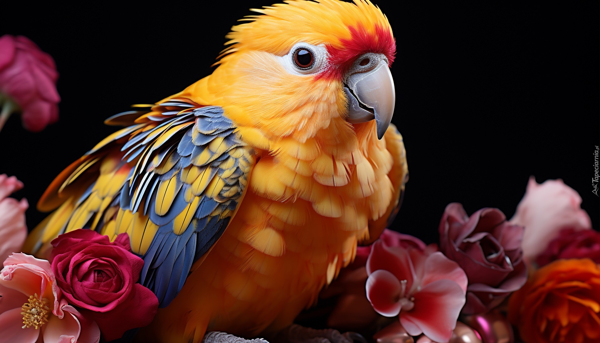 Edytor tapety: Kolorowa papuga i kwiaty na czarnym tle