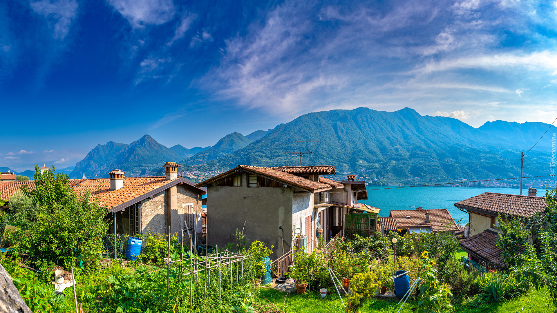 Edytor tapety: Domy na tle gór i jeziora