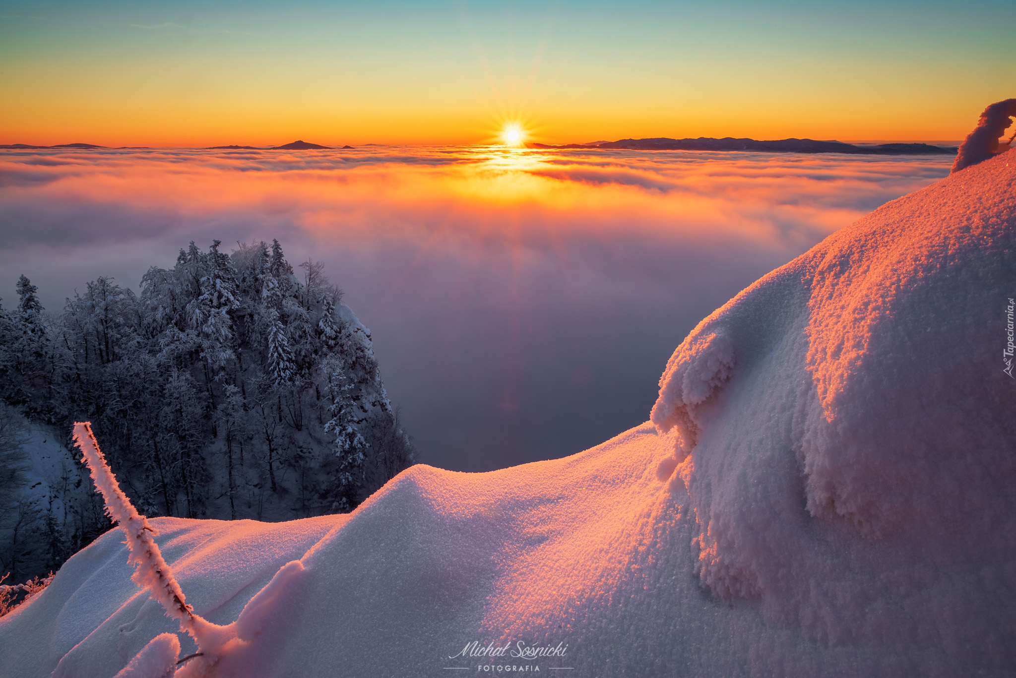 Edytor tapety: Góry zasypane śniegiem i mgła o wschodzie słońca