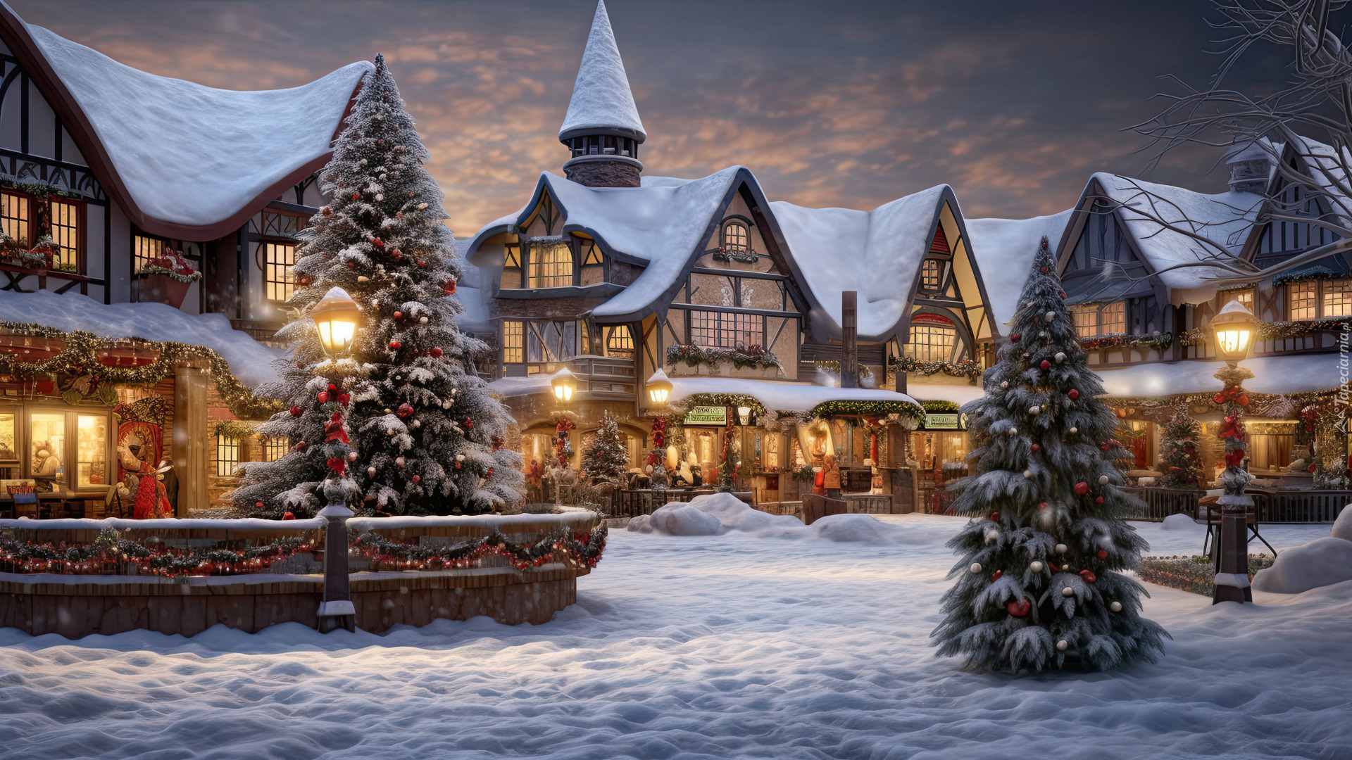 Edytor tapety: Oświetlone domy przy zaśnieżonym placu z choinkami