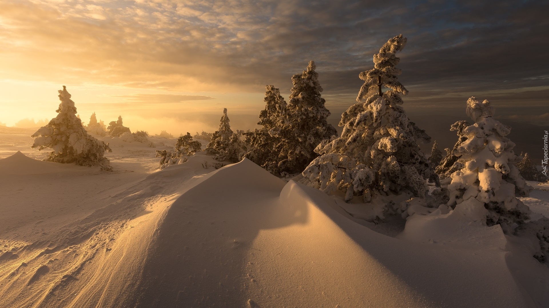 Edytor tapety: Ośnieżone drzewa i zaspy w słonecznym blasku