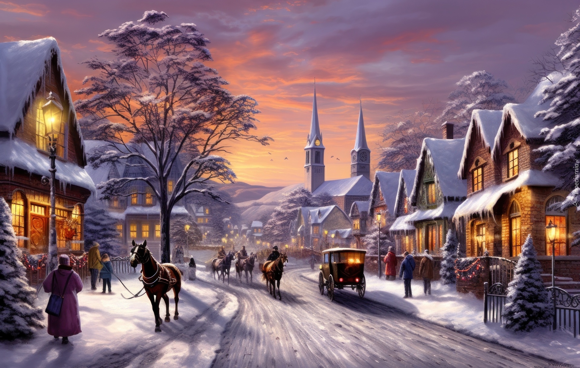 Edytor tapety: Ośnieżone domy i drzewa przy ulicy