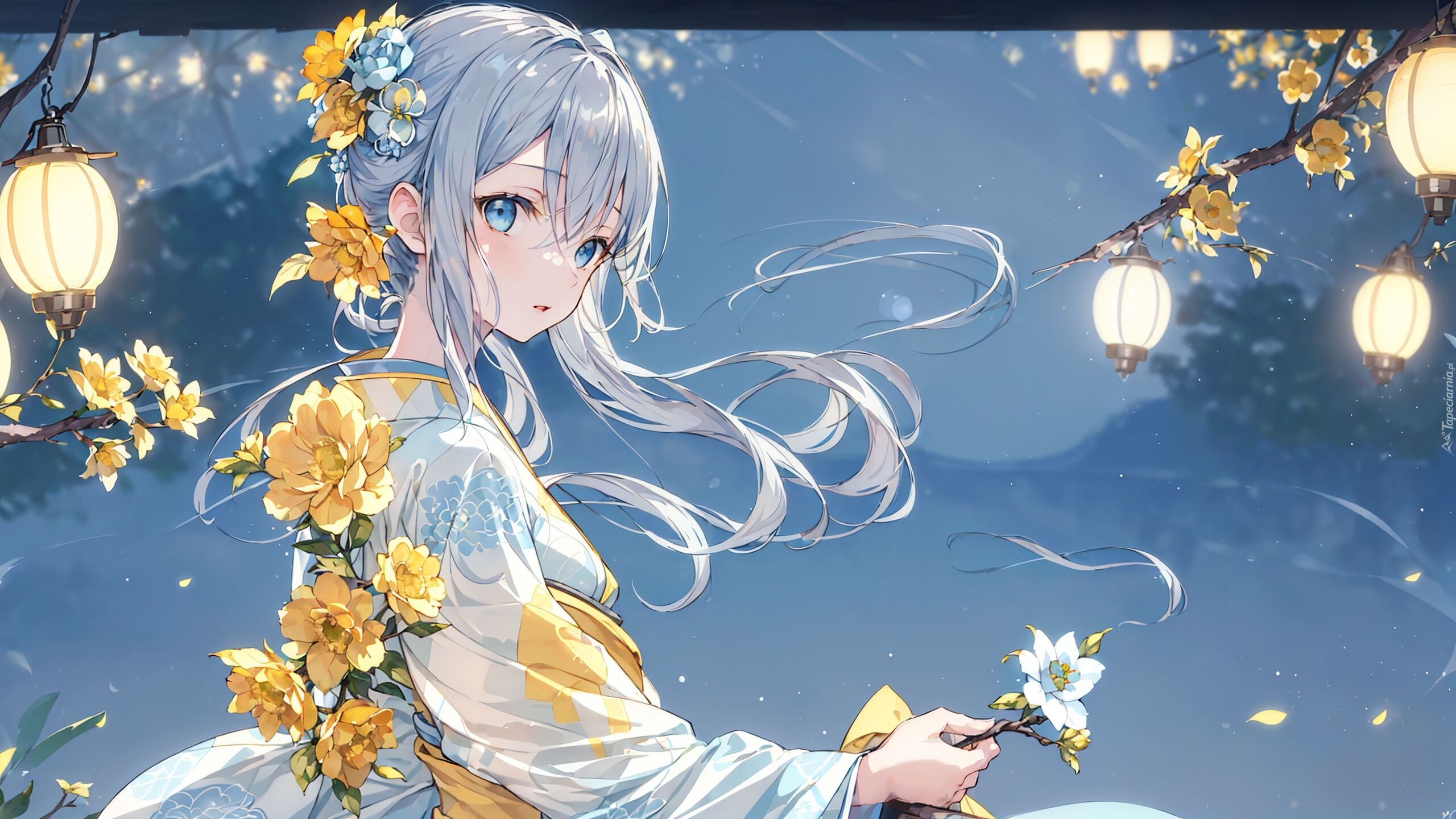 Edytor tapety: Dziewczyna w kimonie z kwiatkiem w dłoni