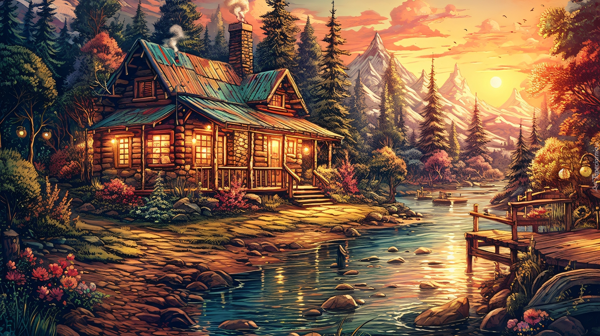 Edytor tapety: Drewniany oświetlony dom na brzegu rzeki