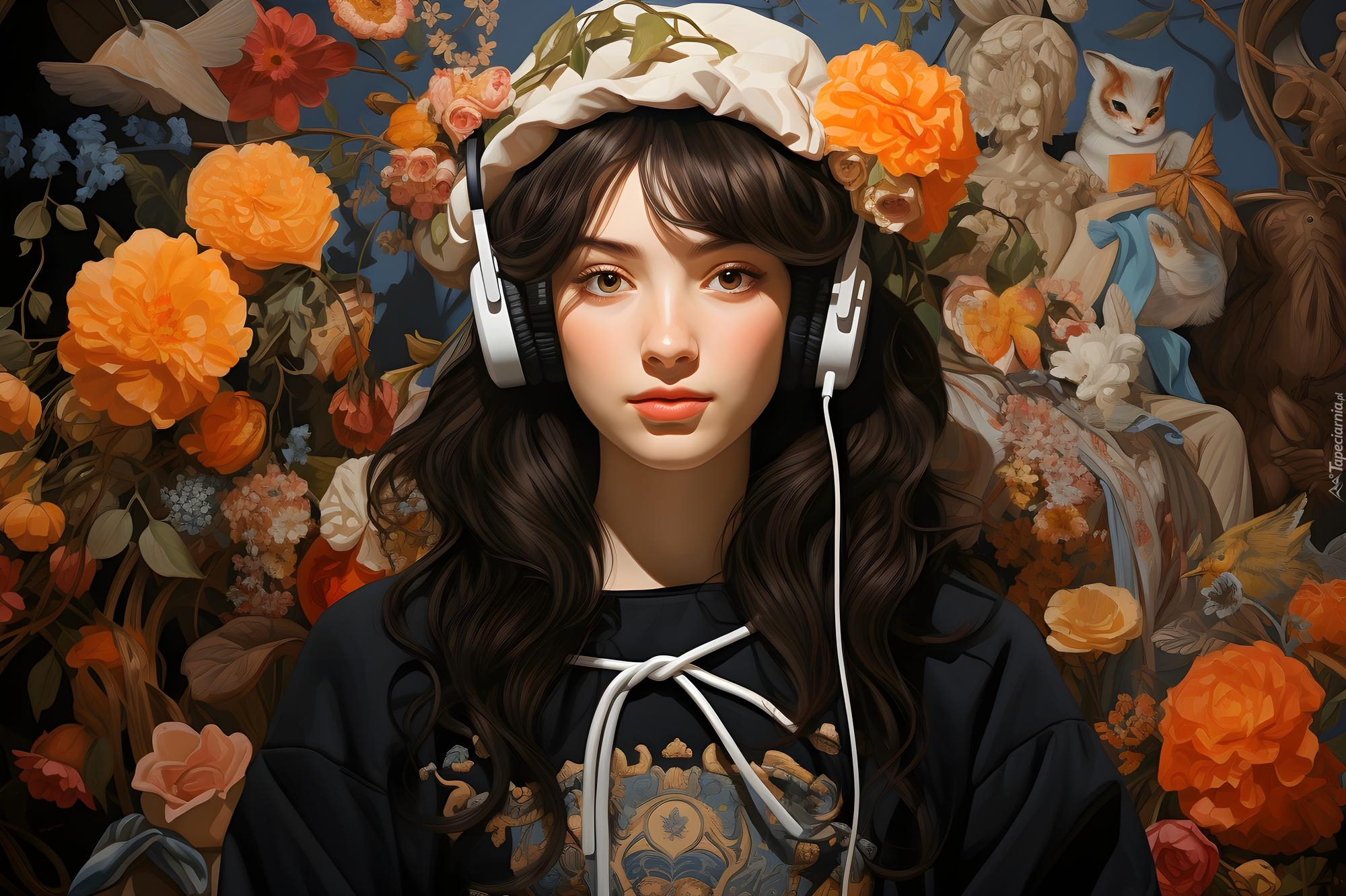Edytor tapety: Dziewczyna ze słuchawkami na tle kwiatów