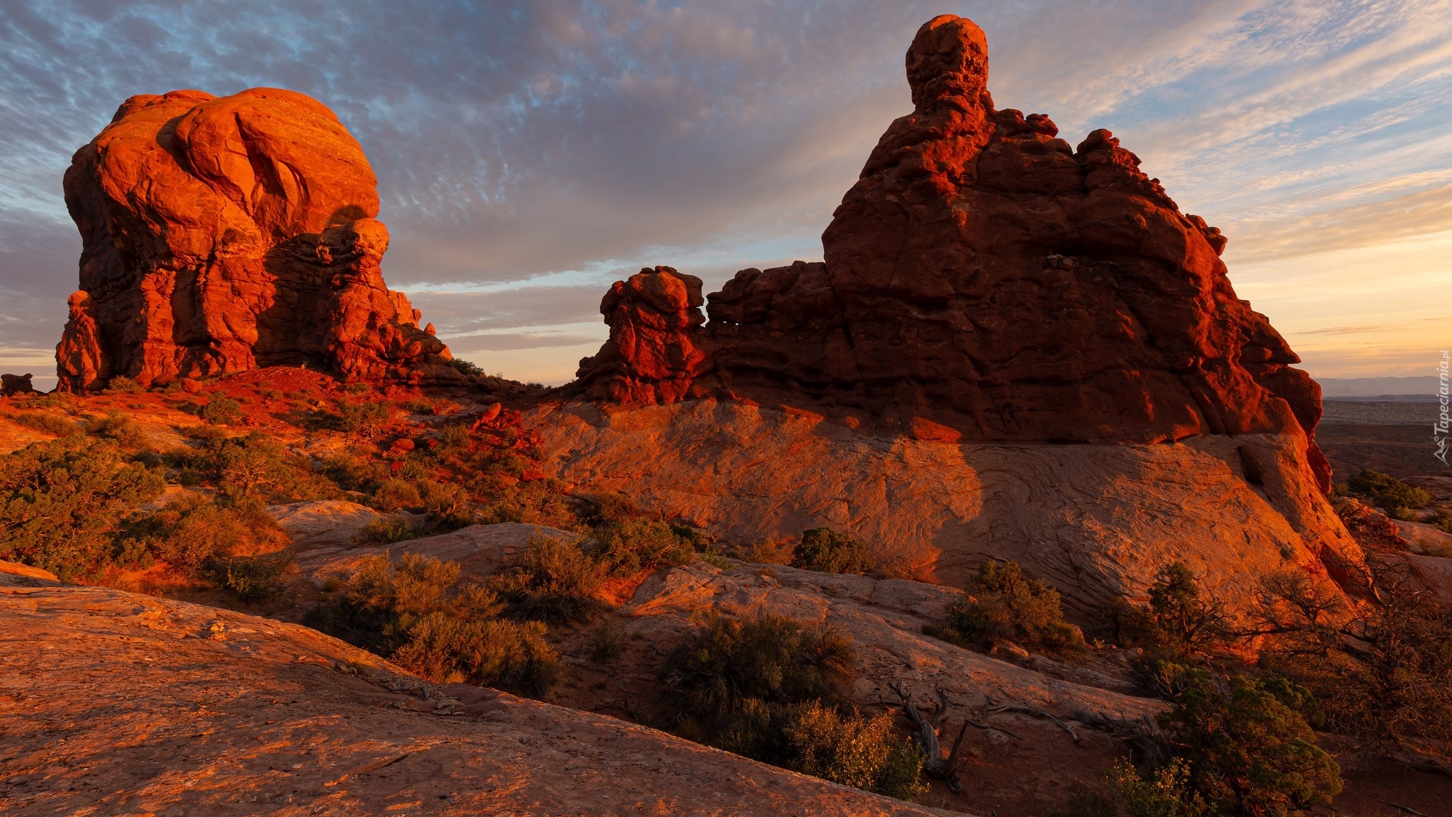 Edytor tapety: Rozświetlone czerwone formacje skalne w Parku Narodowym Arches