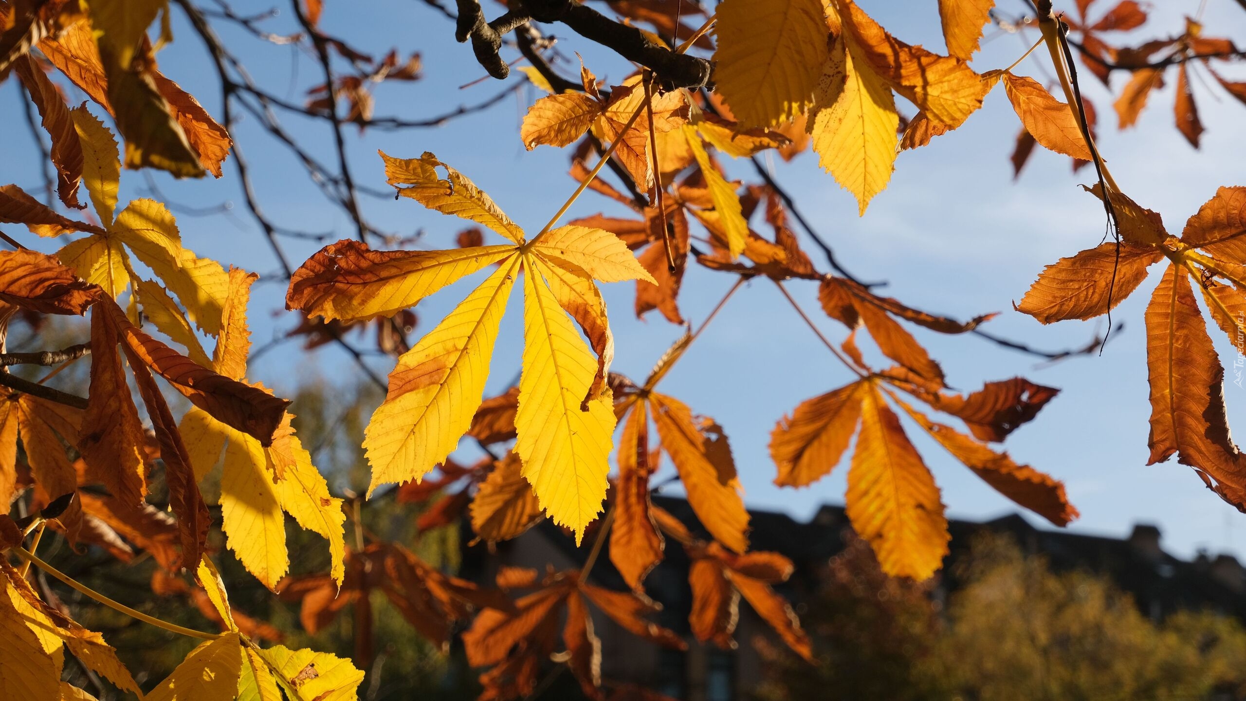 Edytor tapety: Rozświetlone pożółkłe liście kasztanowca na gałęziach