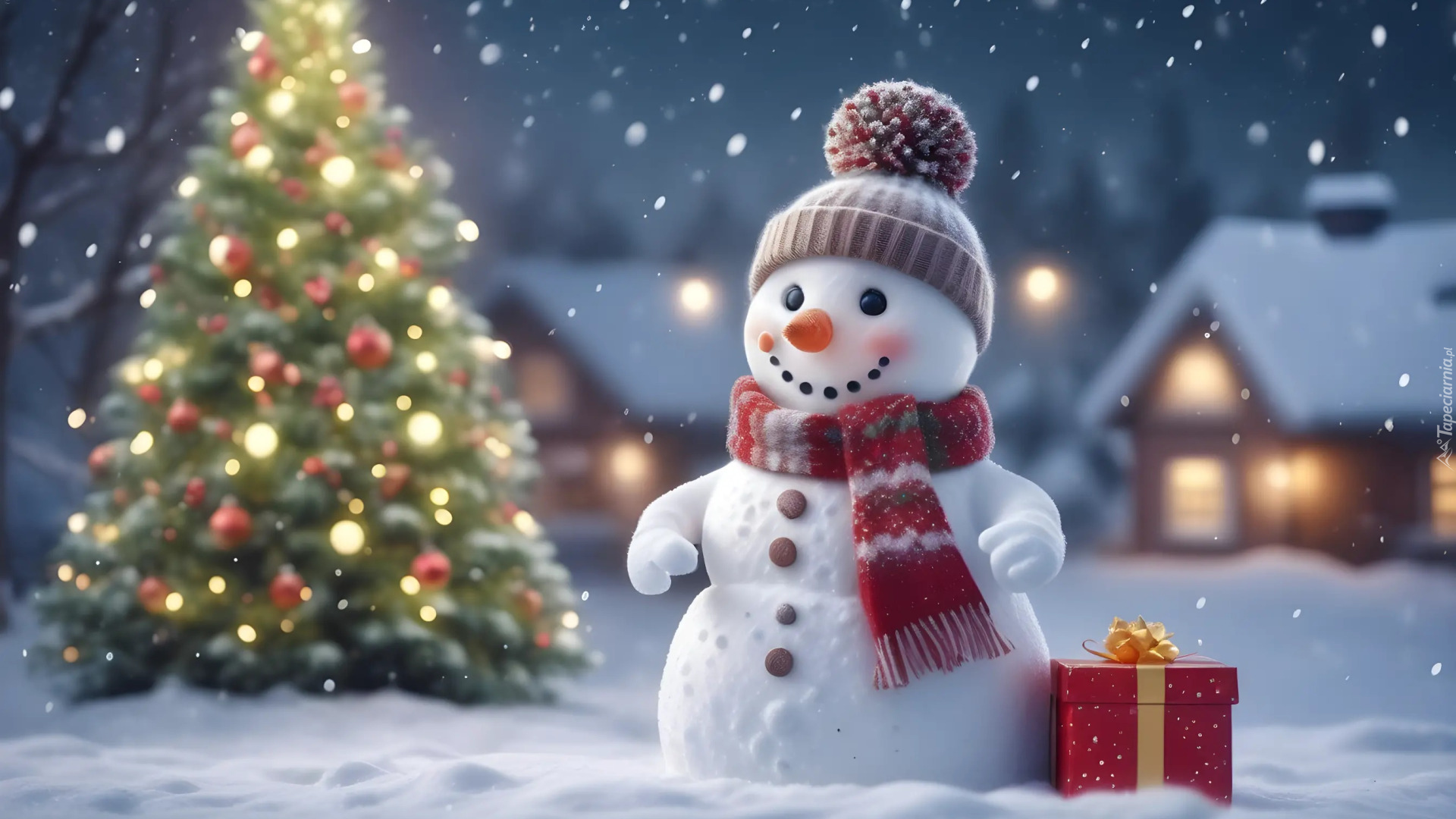 Edytor tapety: Bałwan i prezent na śniegu obok choinki