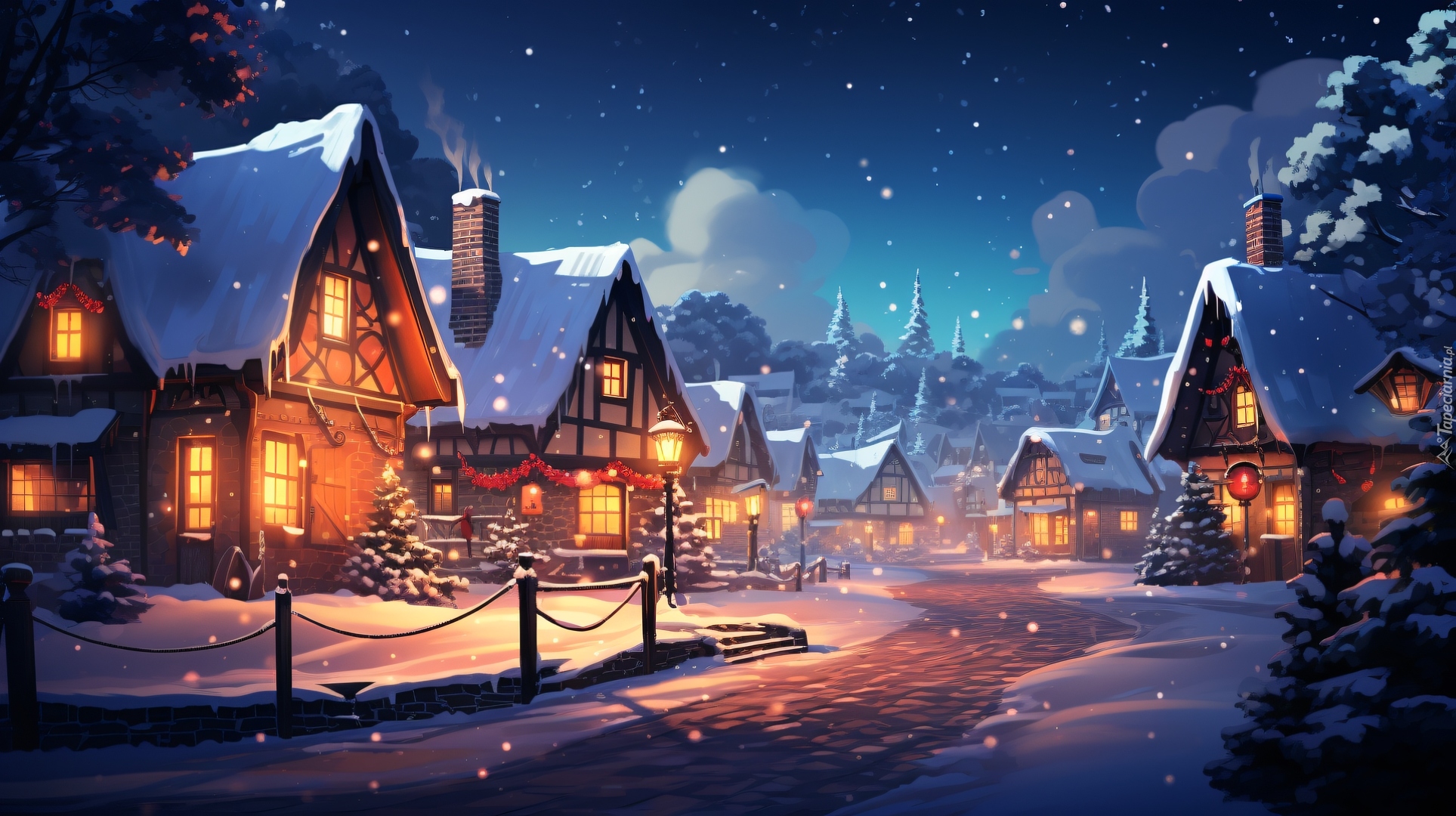 Edytor tapety: Oświetlone domy w zimową noc