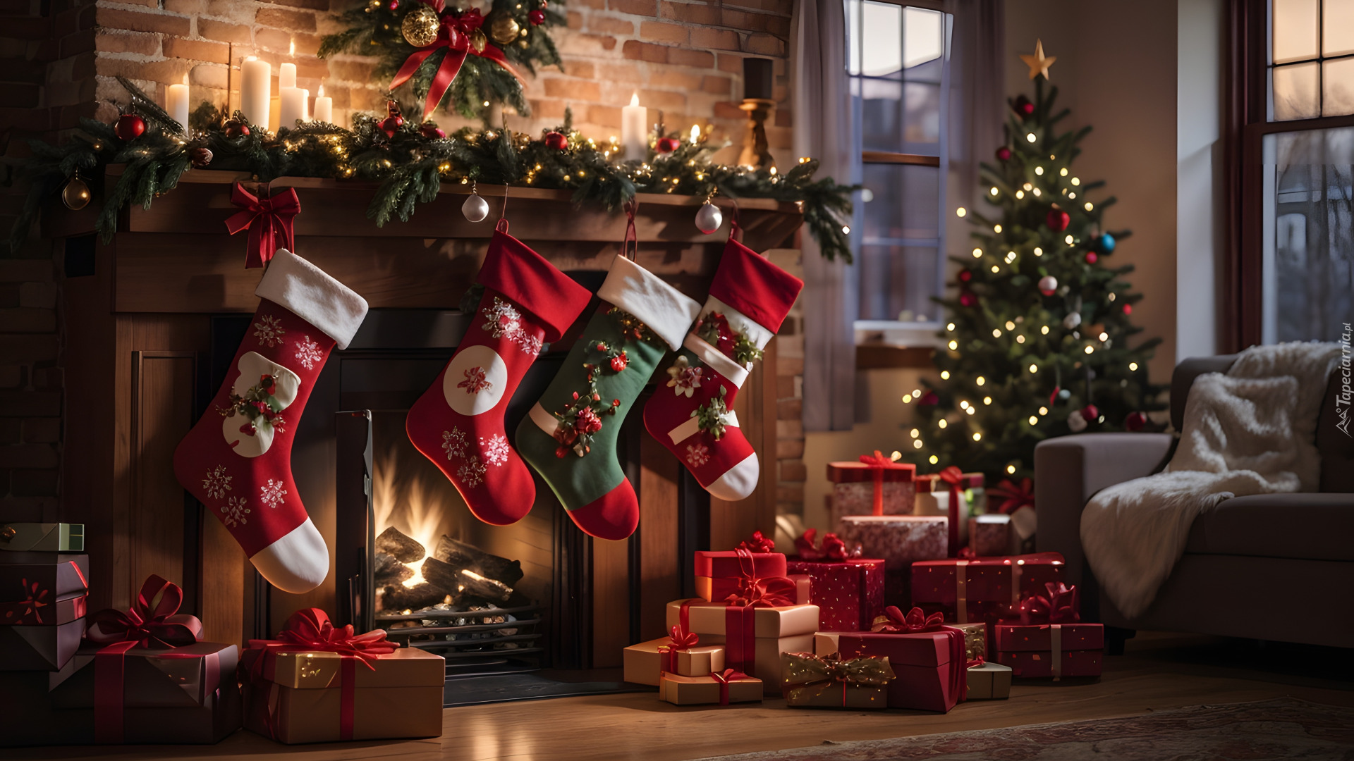 Edytor tapety: Skarpety świąteczne z prezentami na kominku