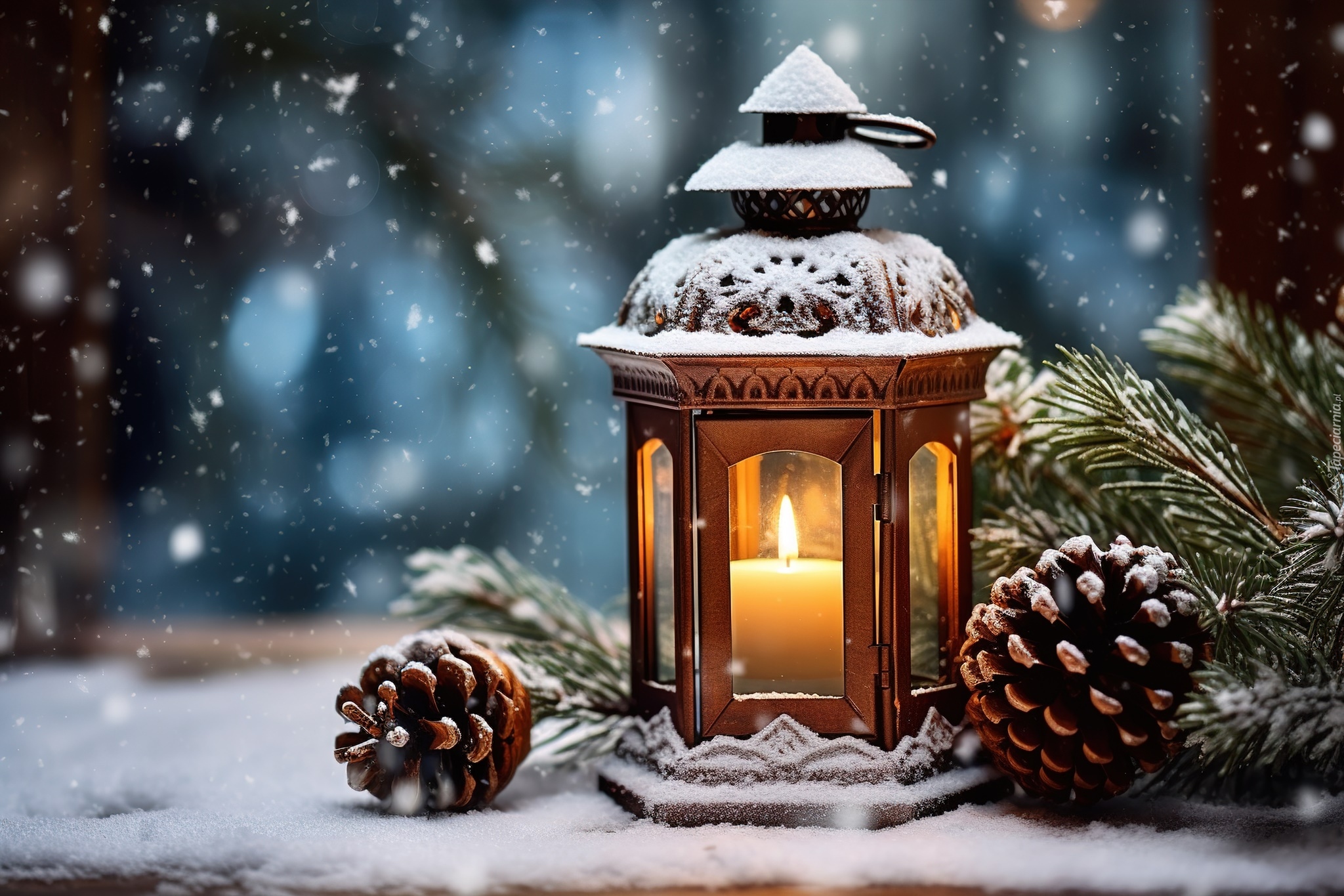Edytor tapety: Płonąca świeca w lampionie obok szyszek i gałązek