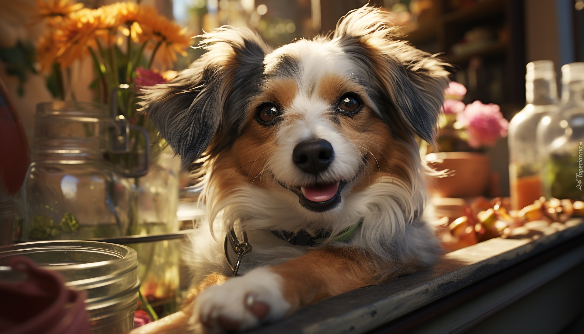 Edytor tapety: Kudłaty pies i szklane naczynia
