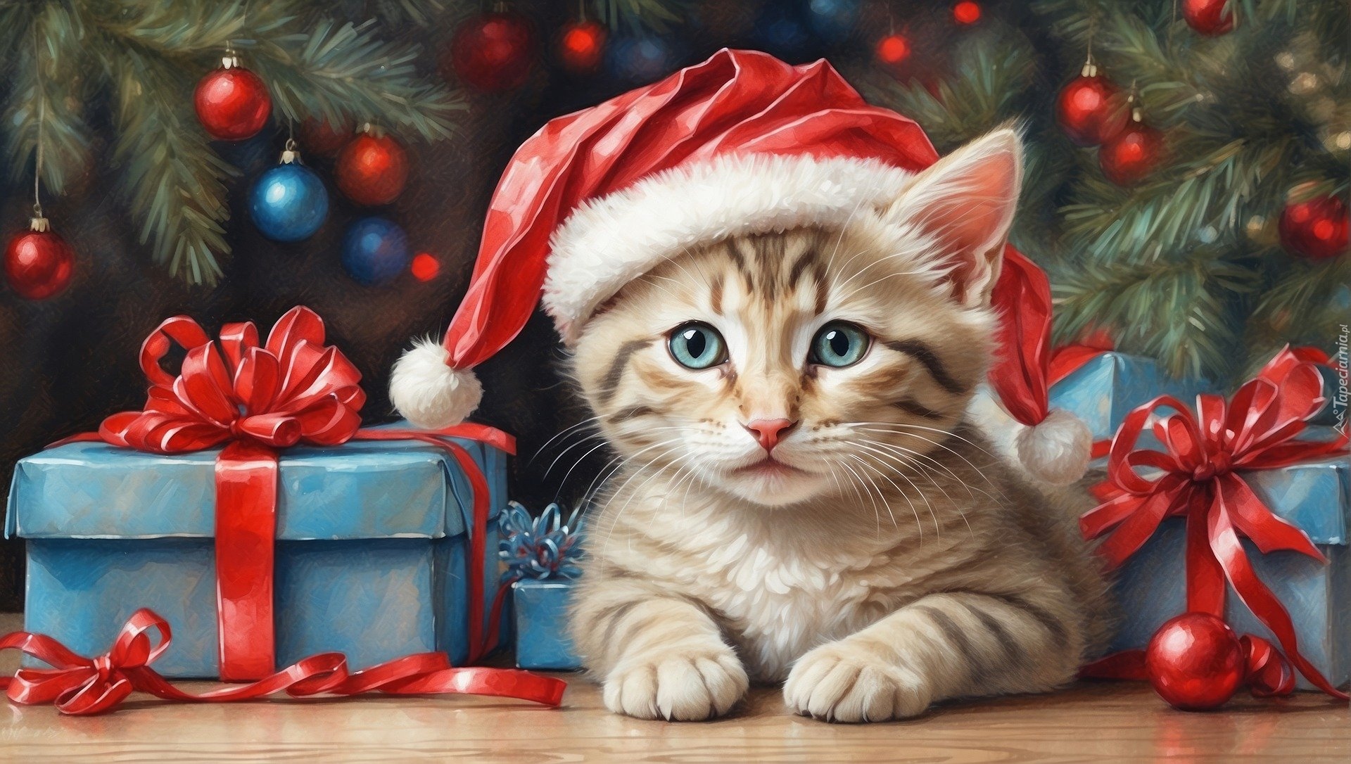 Edytor tapety: Kotek w czapce Mikołaja i prezenty pod choinką