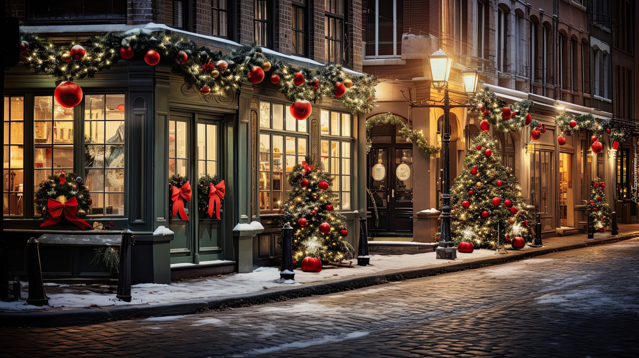 Edytor tapety: Choinki i udekorowane girlandami witryny sklepów nocną porą