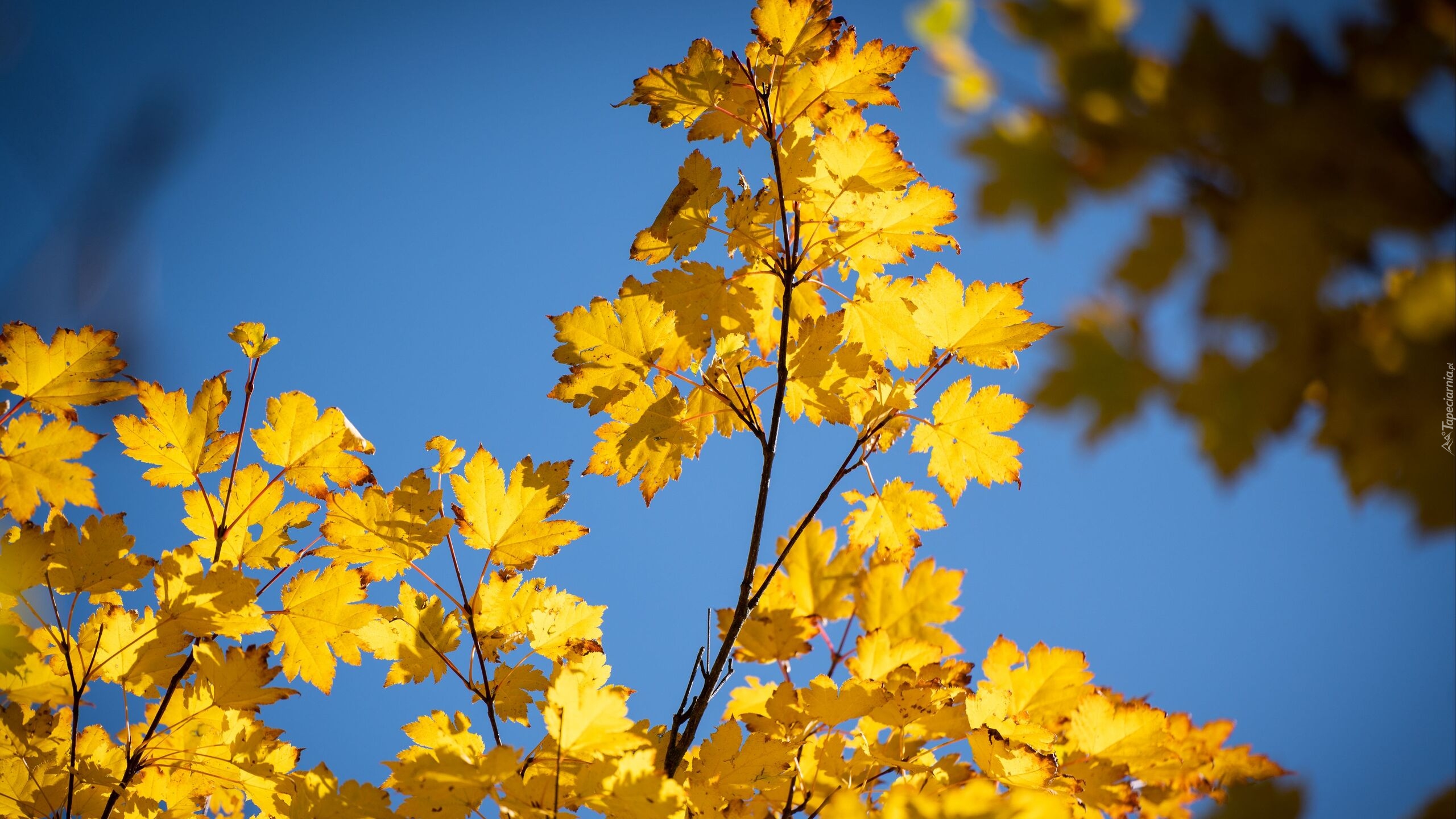 Edytor tapety: Rozświetlone pożółkłe liście na tle błękitnego nieba
