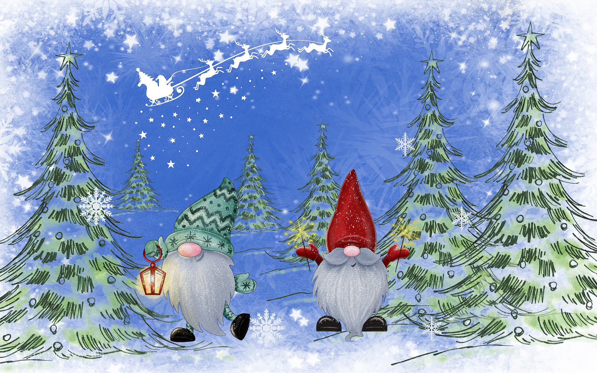 Edytor tapety: Skrzaty wśród choinek i zaprzęg Mikołaja na niebie