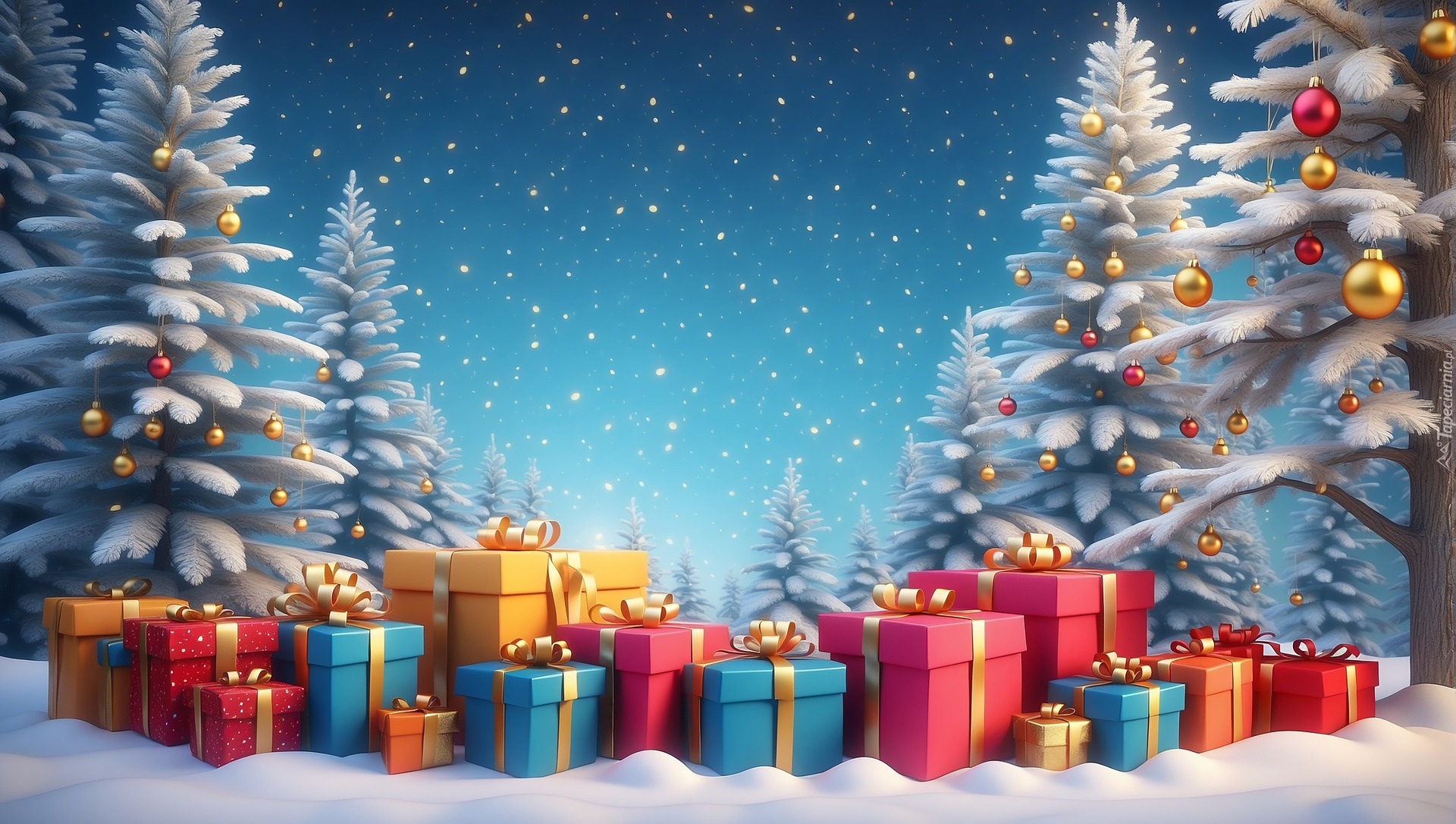 Edytor tapety: Prezenty na śniegu obok choinek