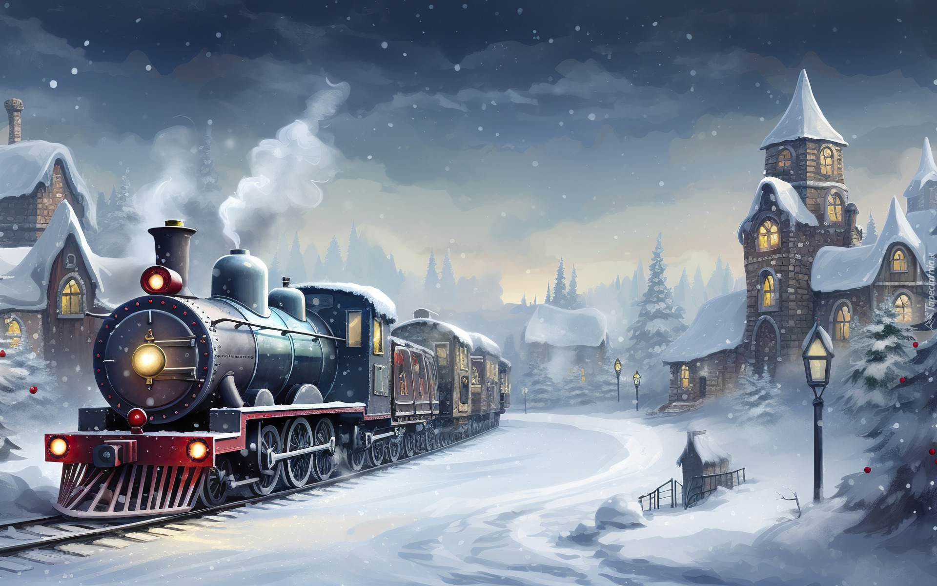 Edytor tapety: Lokomotywa z wagonami na tle ośnieżonych domków