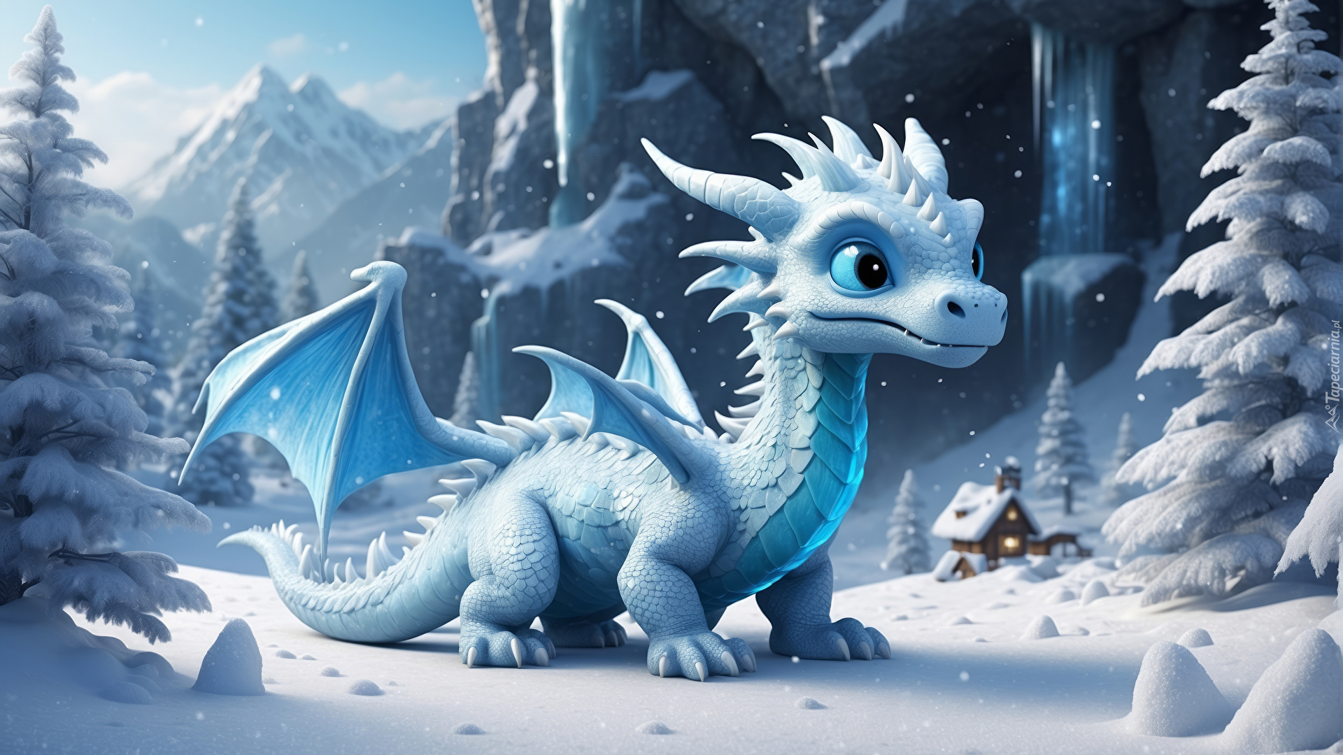 Edytor tapety: Niebieski smok na tle ośnieżonych gór