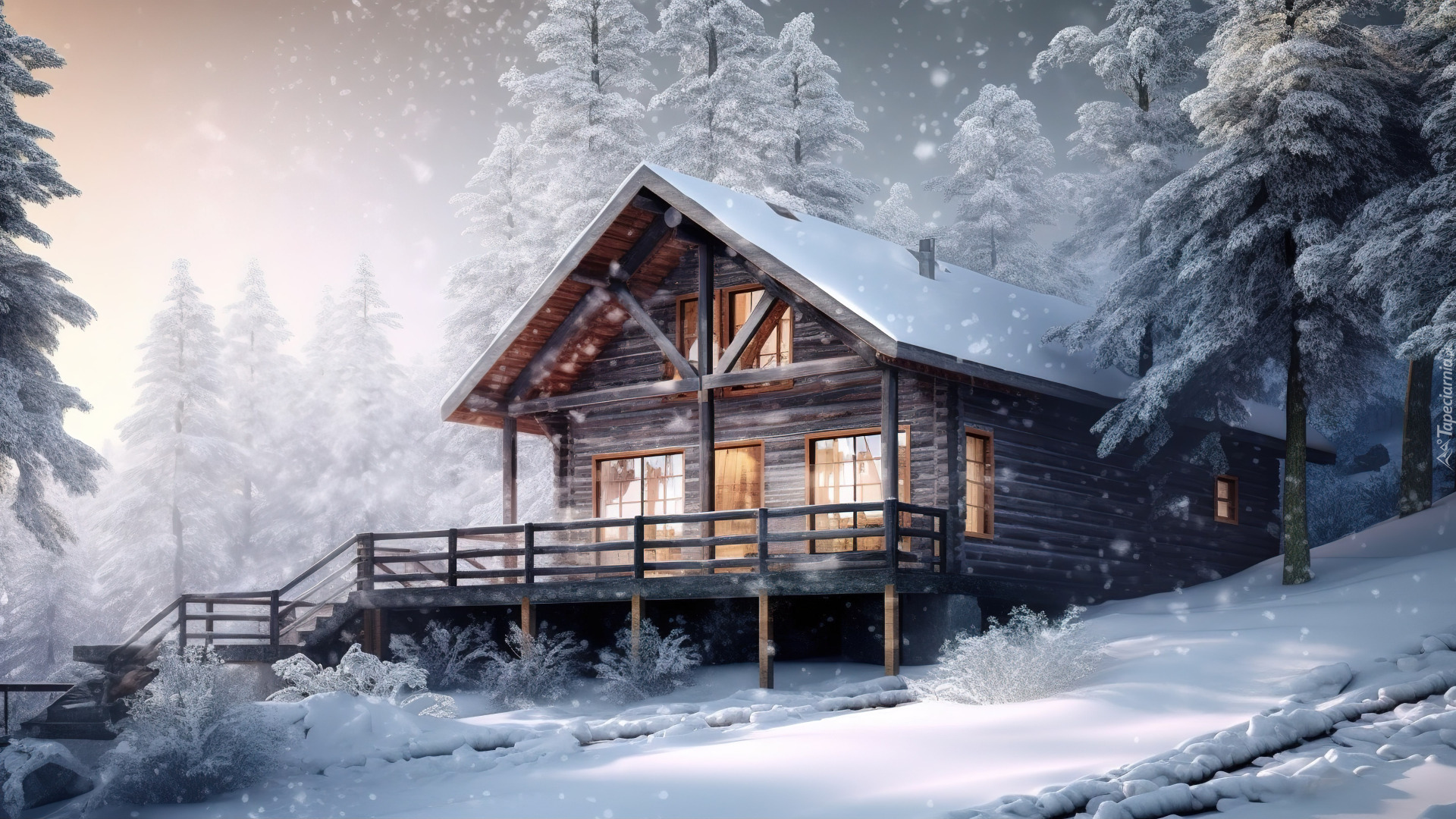 Edytor tapety: Oświetlony drewniany dom na zaśnieżonym wzgórzu