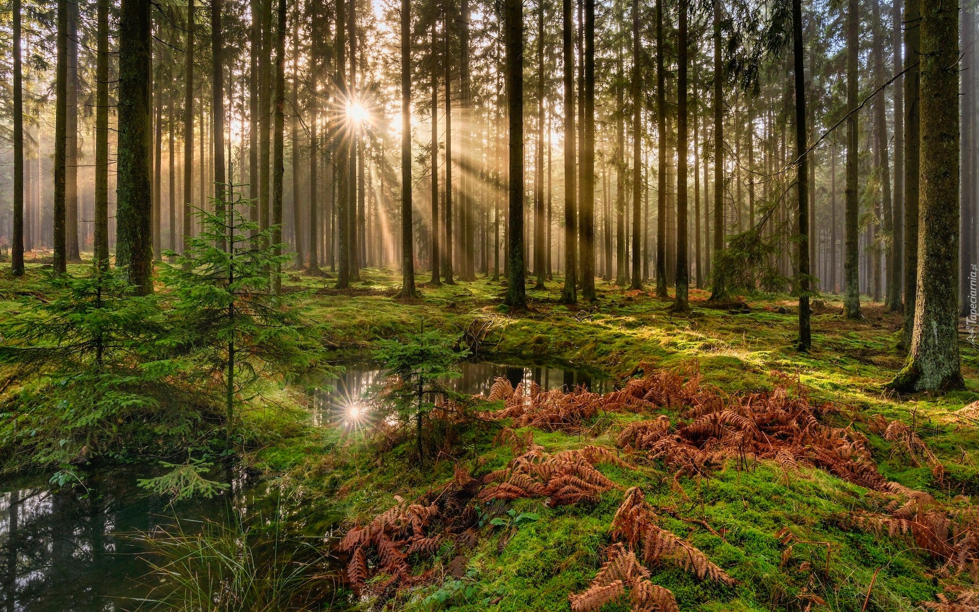 Edytor tapety: Zrudziałe paprocie i mech w słonecznym lesie