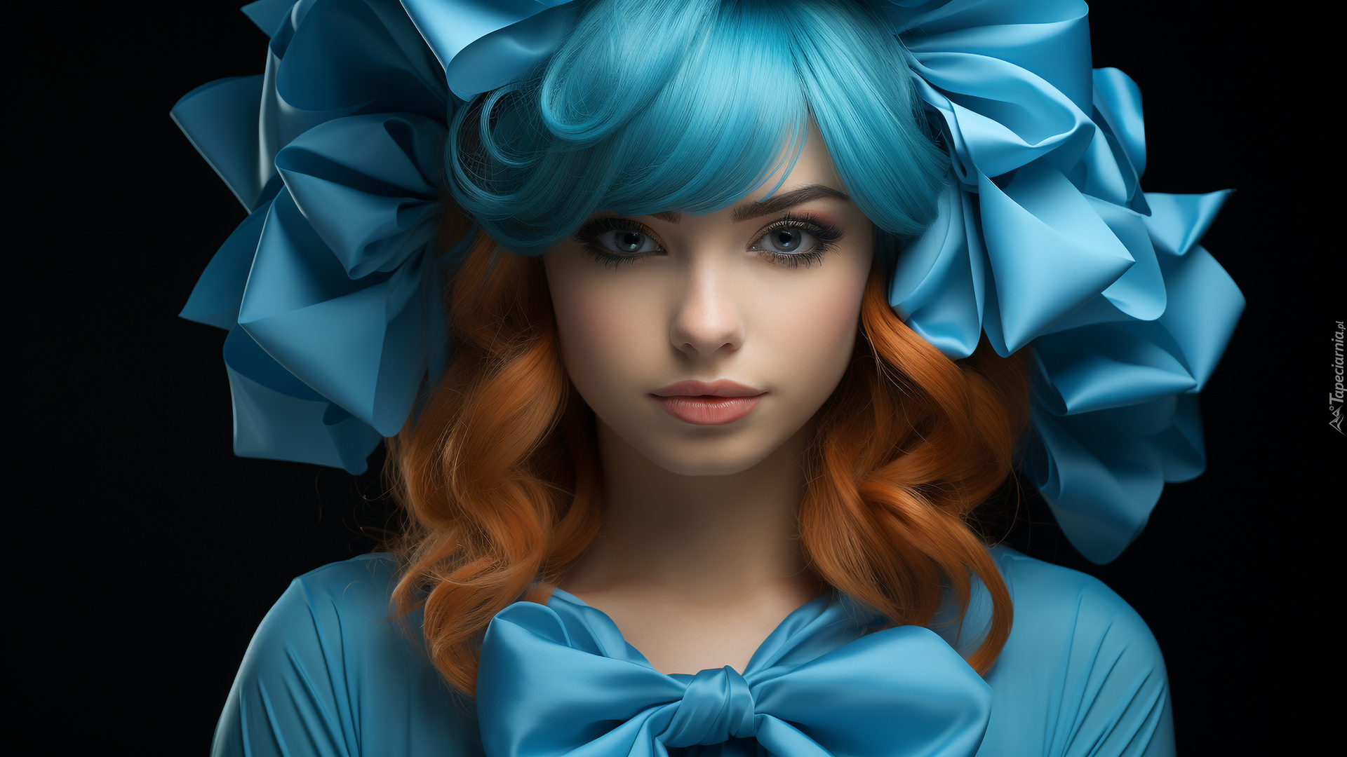Edytor tapety: Twarz kobiety z niebieskimi kokardami we włosach