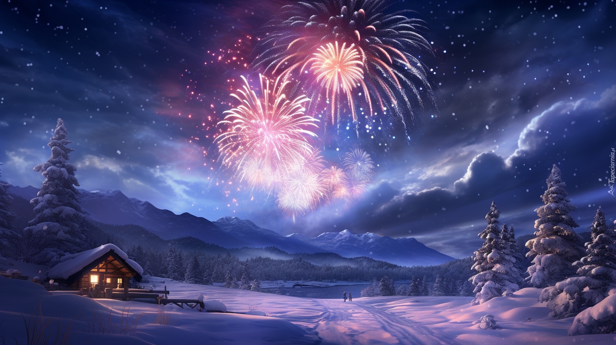 Edytor tapety: Fajerwerki nad górami i oświetlonym domem