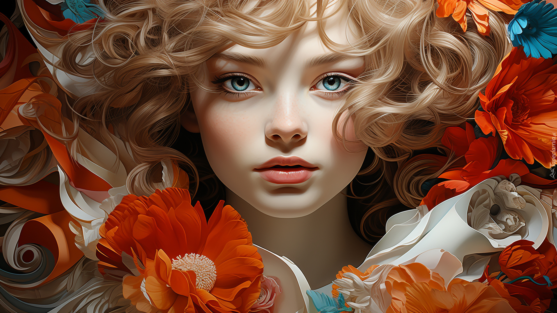 Edytor tapety: Dziewczynka otulona kwiatami w grafice