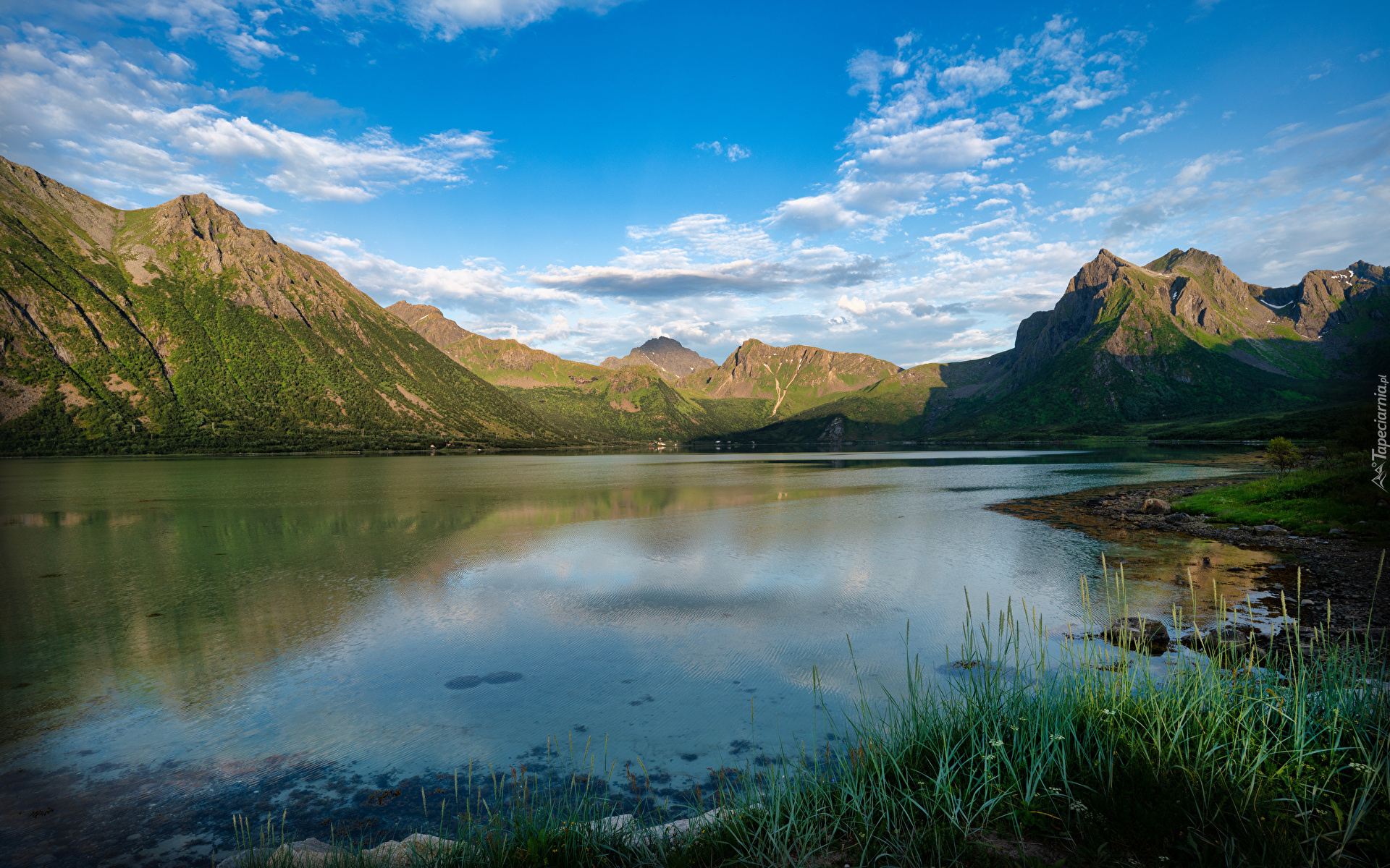 Edytor tapety: Widok znad jeziora na góry i białe chmury