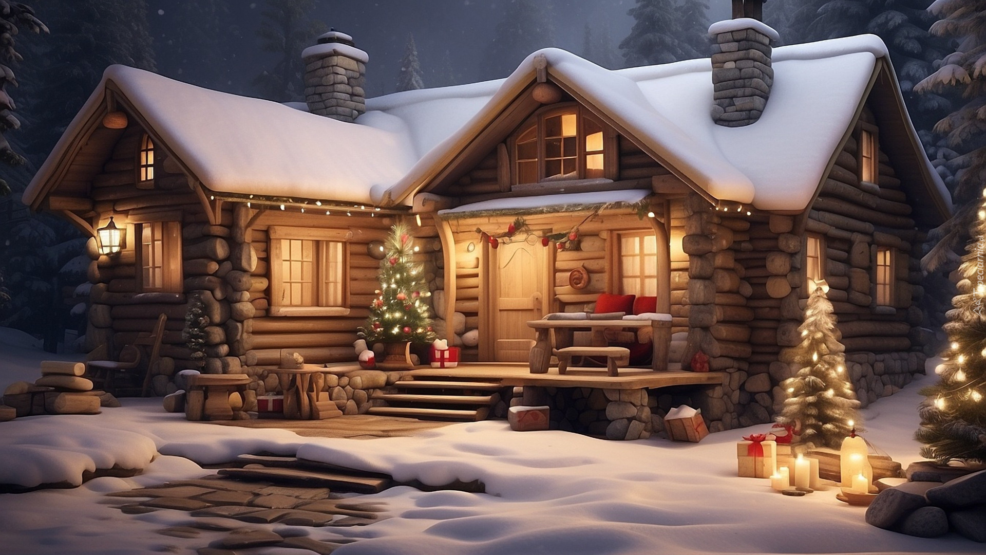 Edytor tapety: Oświetlona drewniana chata i choinki