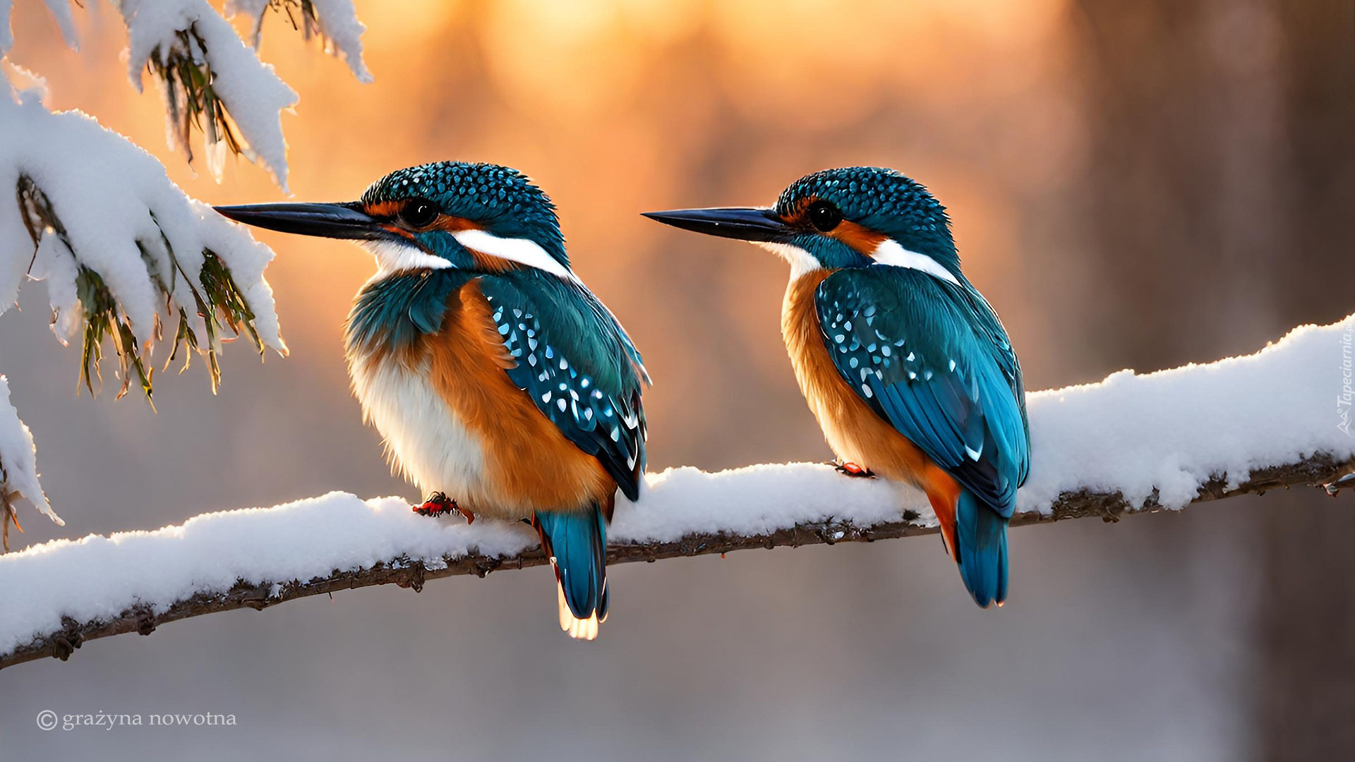 Edytor tapety: Dwa zimorodki na ośnieżonej gałęzi