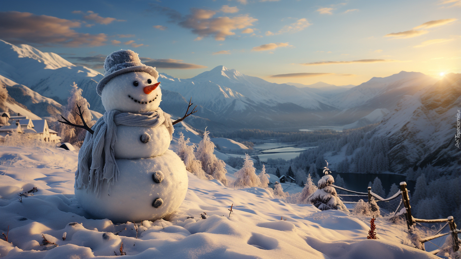 Edytor tapety: Bałwanek na wzgórzu z widokiem na góry