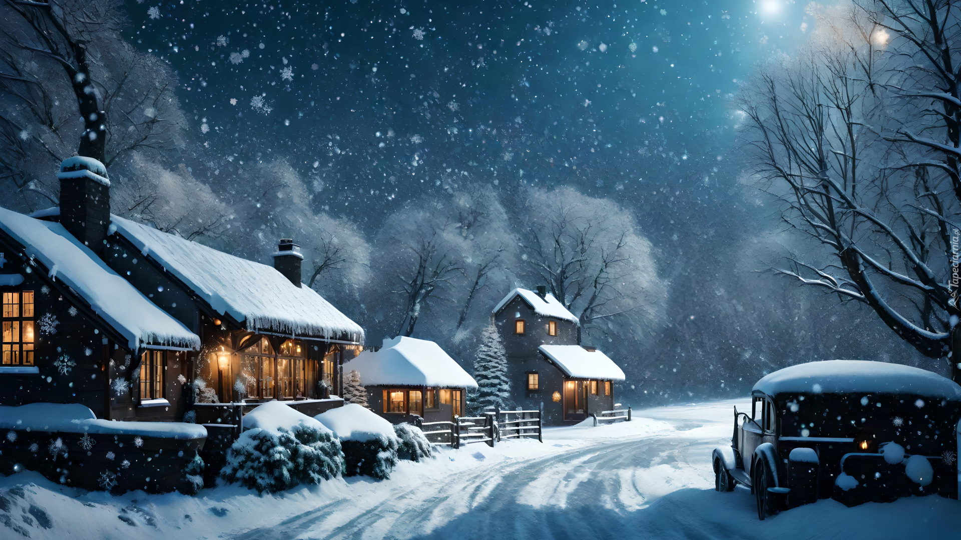 Edytor tapety: Samochód i oświetlone domy przy zaśnieżonej drodze