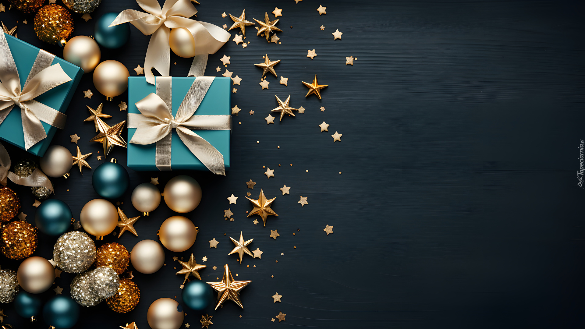 Edytor tapety: Pudełka z prezentami wśród bombek i gwiazdek