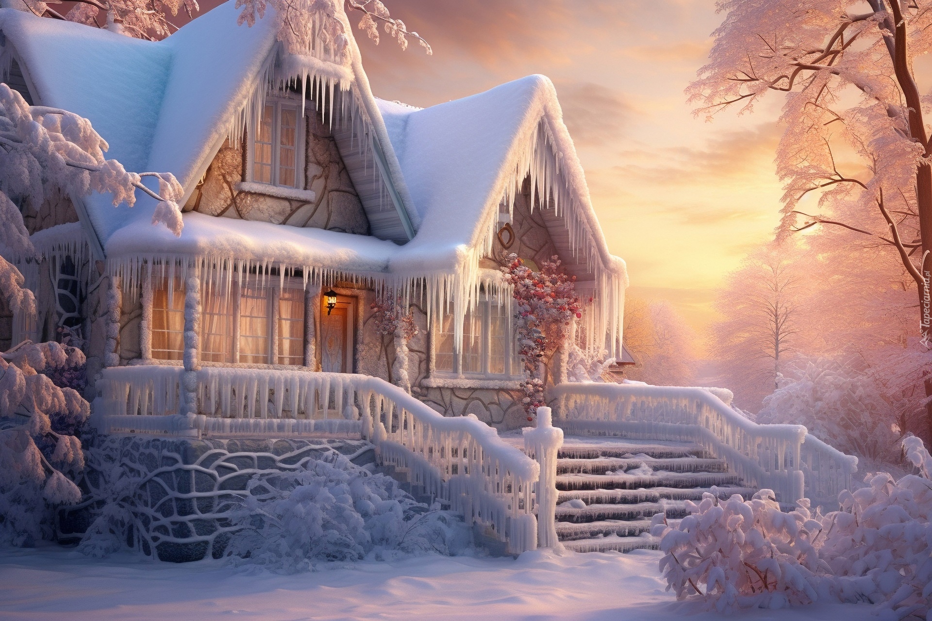 Edytor tapety: Zwisające sople na ośnieżonym dachu domu