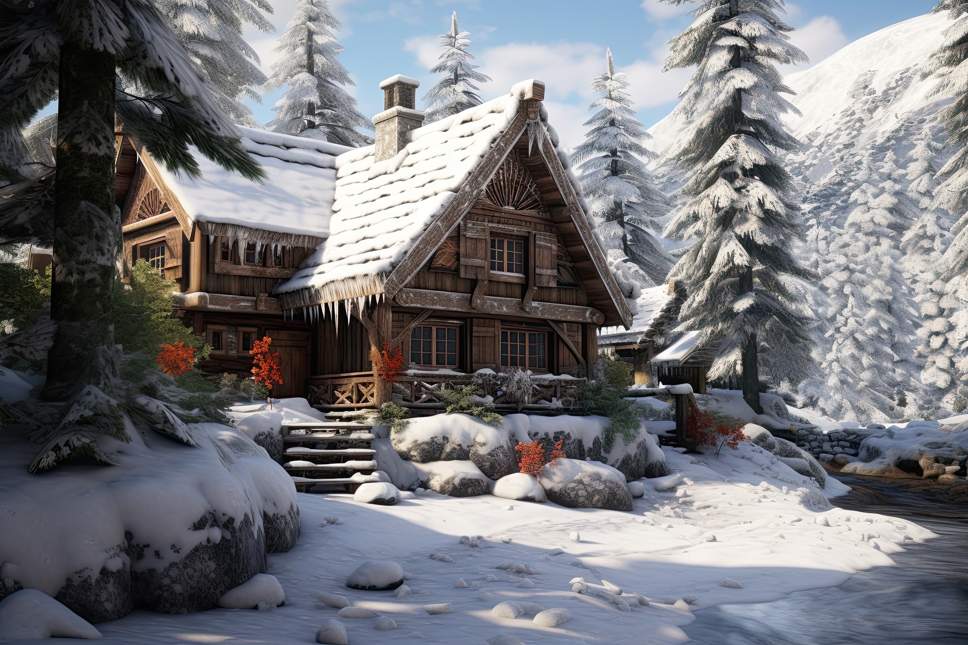 Edytor tapety: Drewniany dom i ośnieżone drzewa w słonecznym blasku