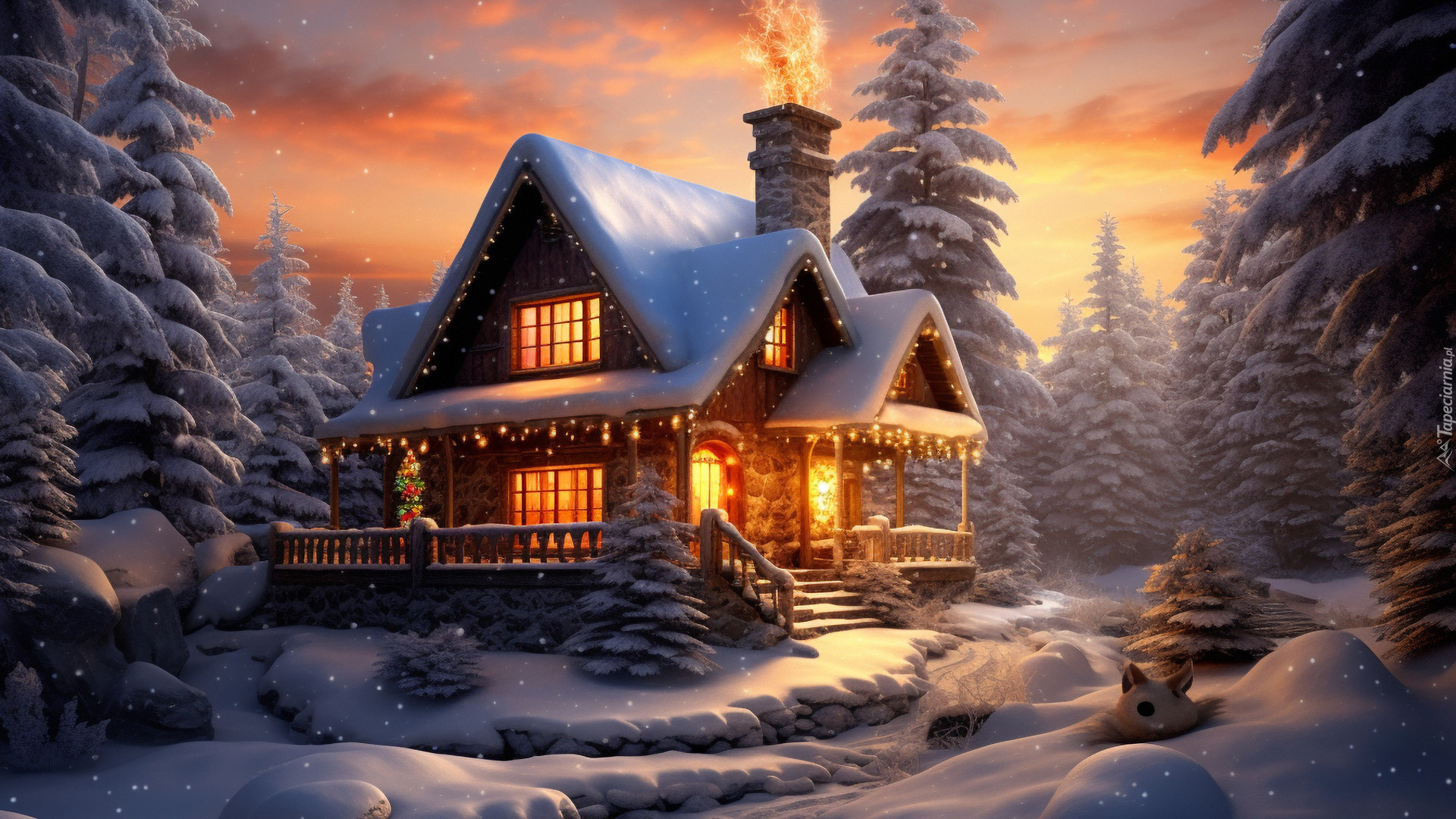 Edytor tapety: Ośnieżony i oświetlony dom pod lasem